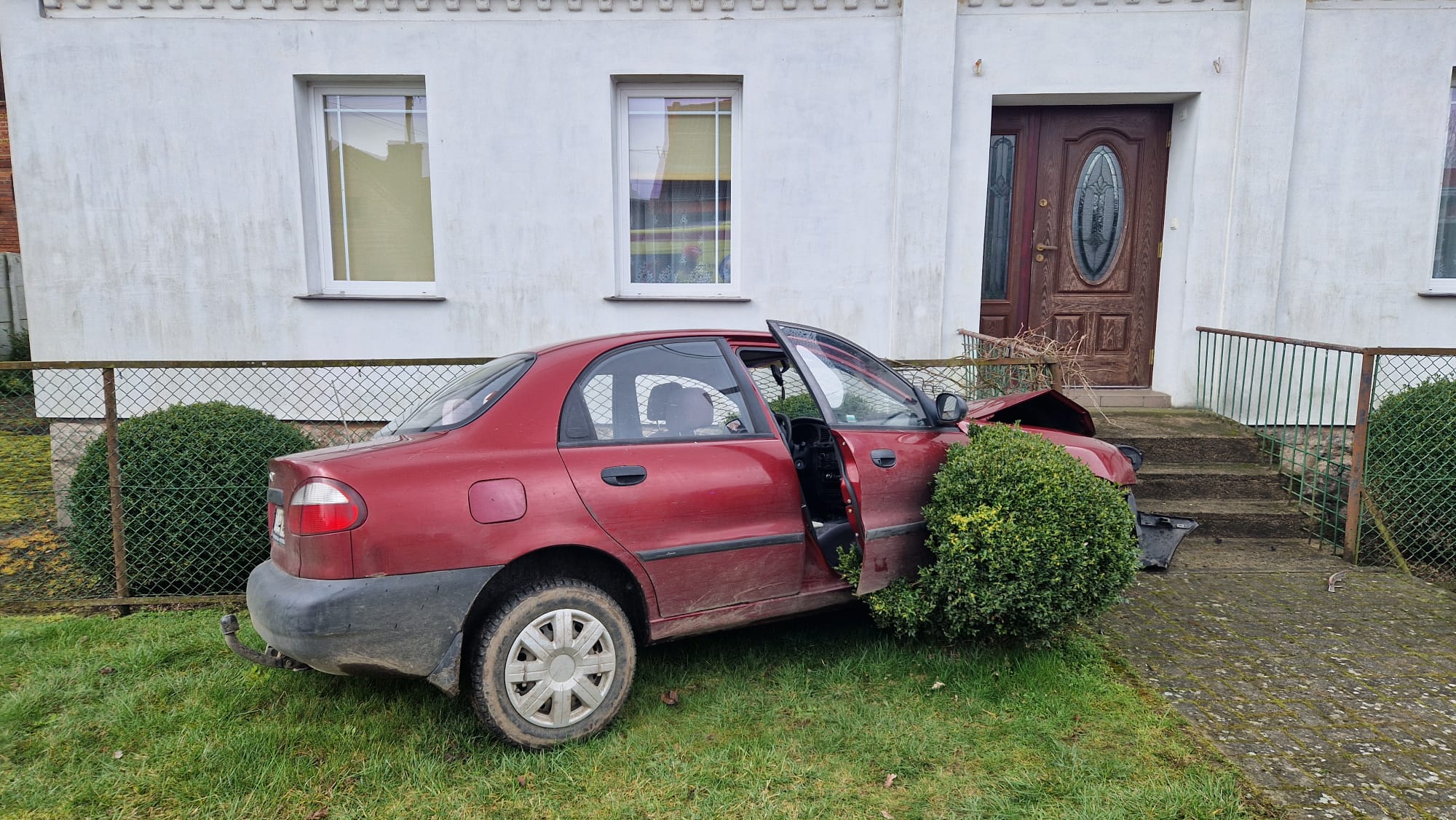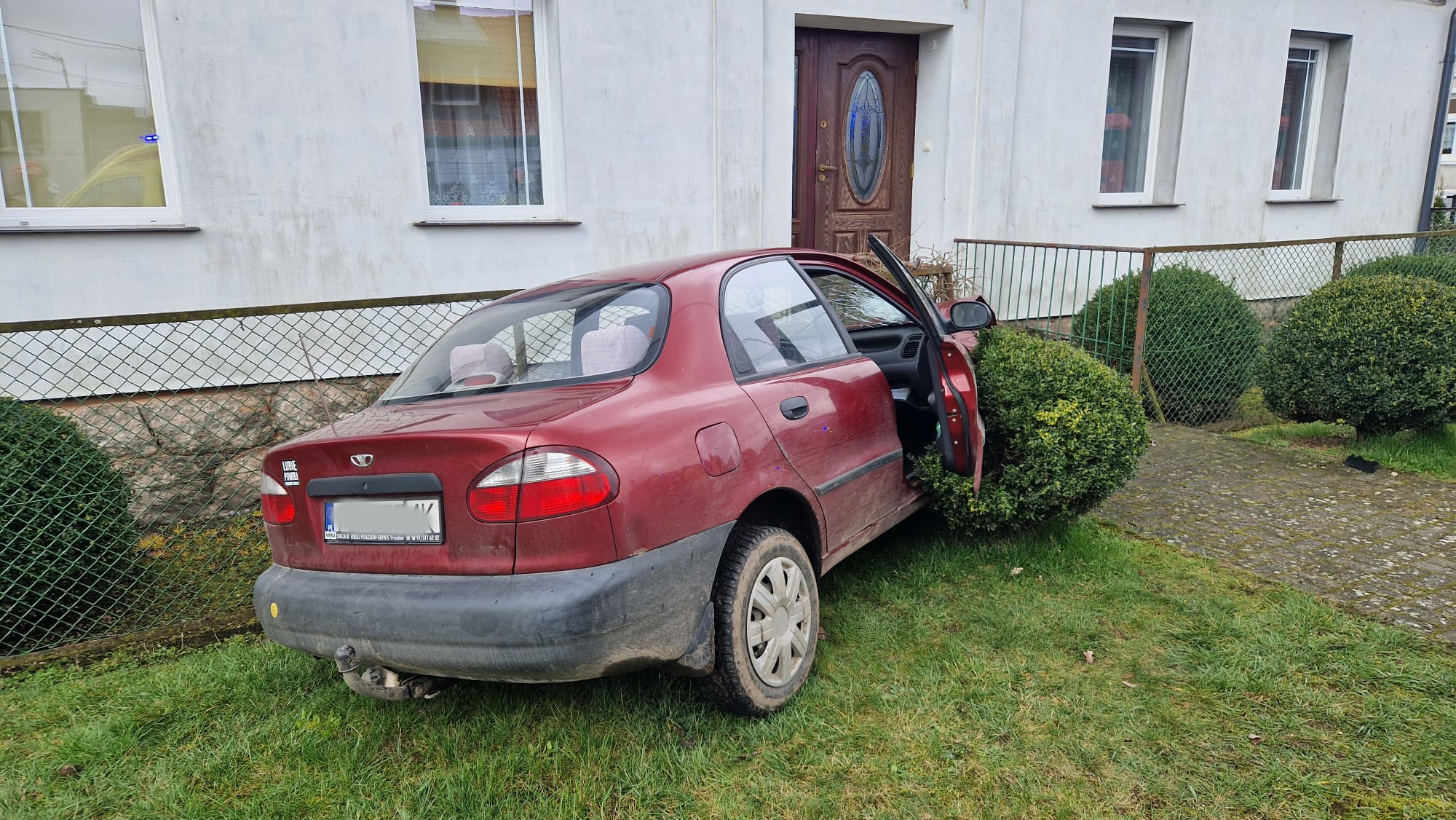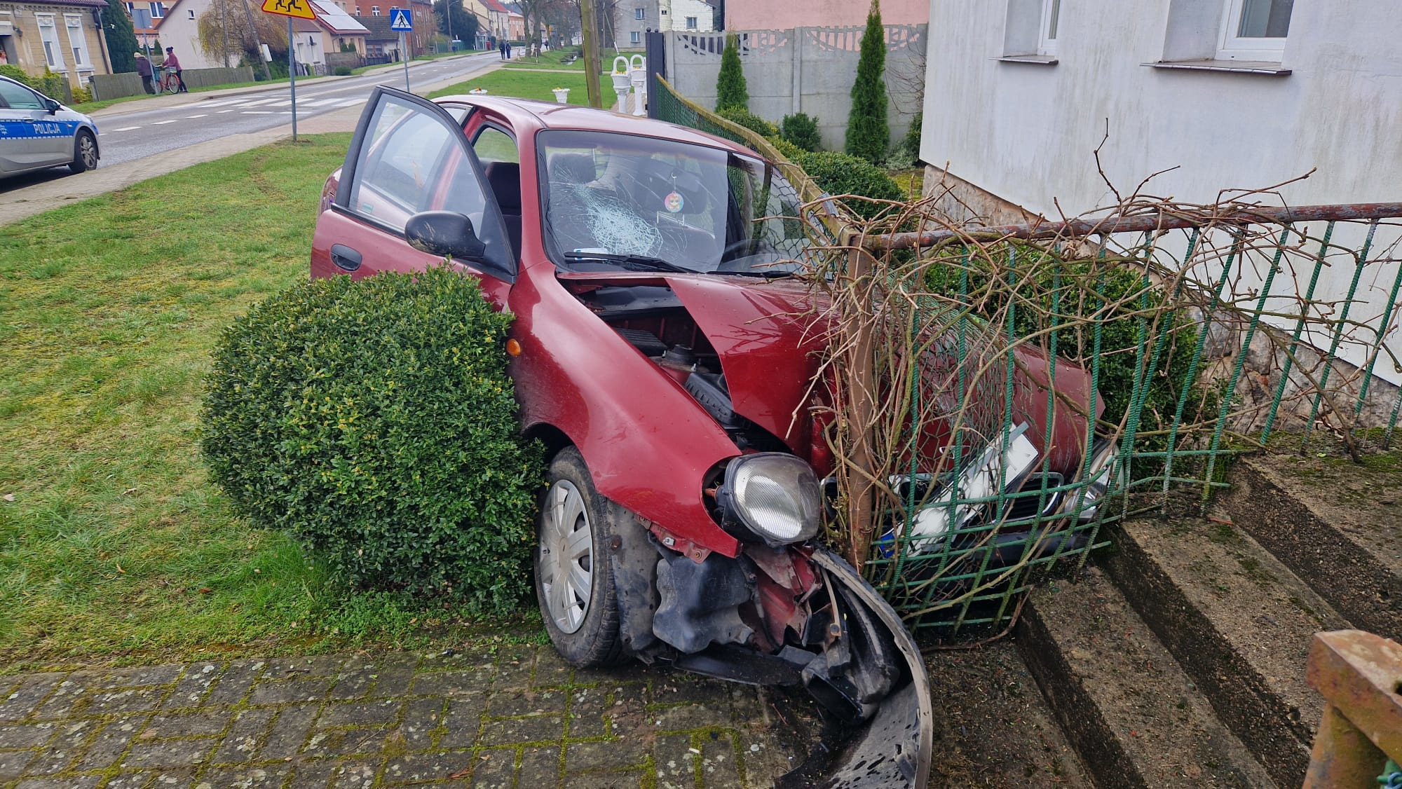 Kierująca pojazdem zjechała z jezdni i po przejechaniu przez chodnik i pobocze uderzyła w ogrodzenie budynku. W wyniku zdarzenia poszkodowana została jedna osoba, która po udzieleniu kwalifikowanej pierwszej pomocy została przetransportowana do szpitala.