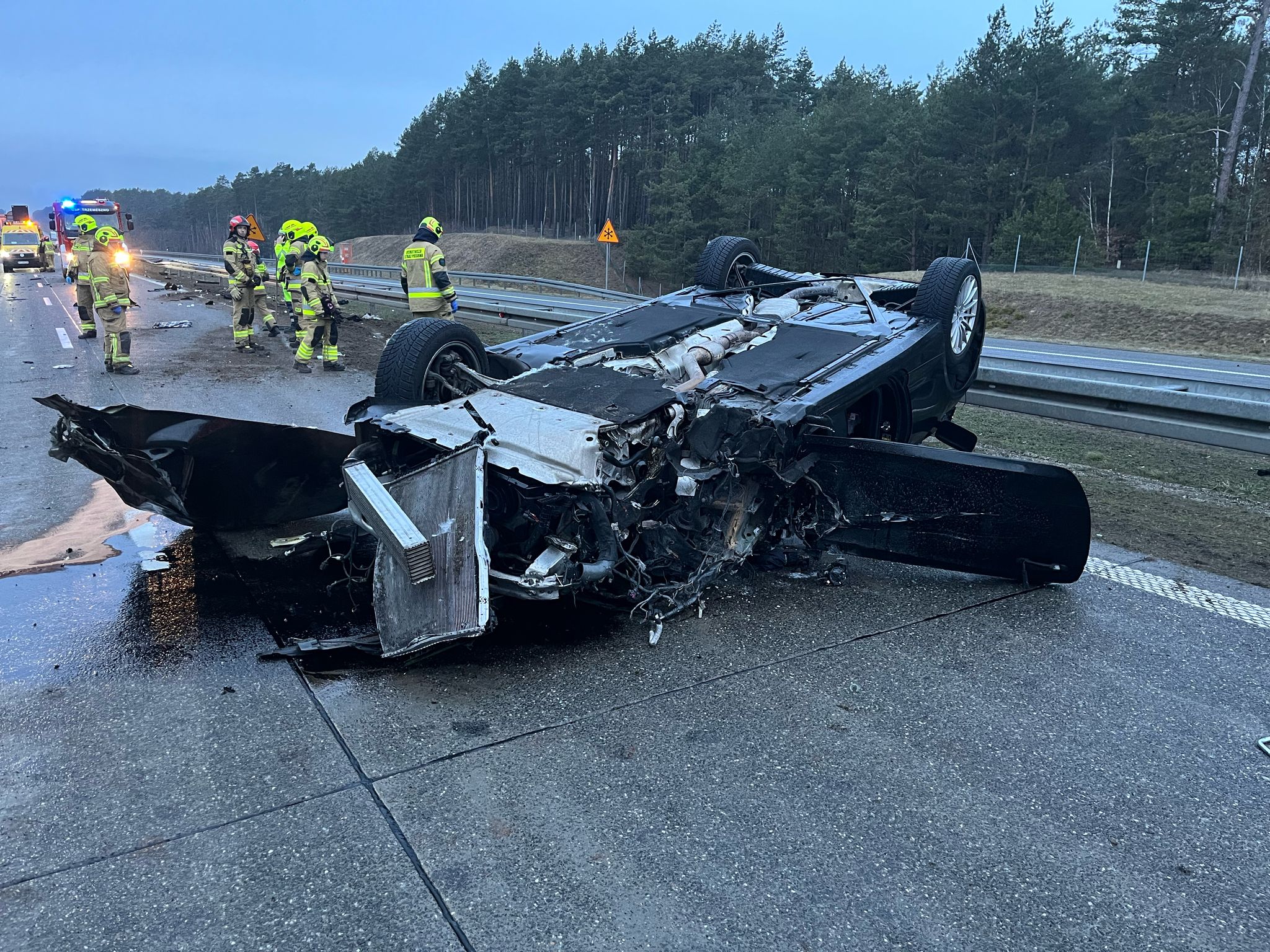 Po zakończonych działaniach w Gądkowie Wlk. zastępy zostały zadysponowane do wypadku na autostradzie A2, w którym samochód osobowy uderzył w naczepę samochodu ciężarowego. W zdarzeniu nie było osób poszkodowanych. Działania zastępów polegały na zabezpieczeniu miejsca zdarzenia, ograniczeniu wycieków płynów eksploatacyjnych z pojazdu i zabezpieczeniu go pod kątem przeciwpożarowym. W zdarzeniu udział brały zastępy z JRG Sulęcin, OSP Torzym i OSP Trzemeszno Lub.