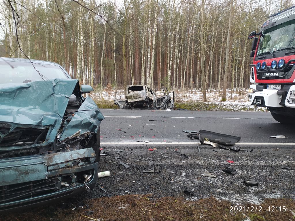 Zderzenie dwóch samochodów osobowych i dwóch samochodów ciężarowych na drodze krajowej nr 22 w okolicach miejscowości Kołczyn. Jeden z pojazdów osobowych spłonął. W zdarzeniu poszkodowanych zostało 5 osób, w tym dwoje dzieci w wieku 10 lat i 10 miesięcy.