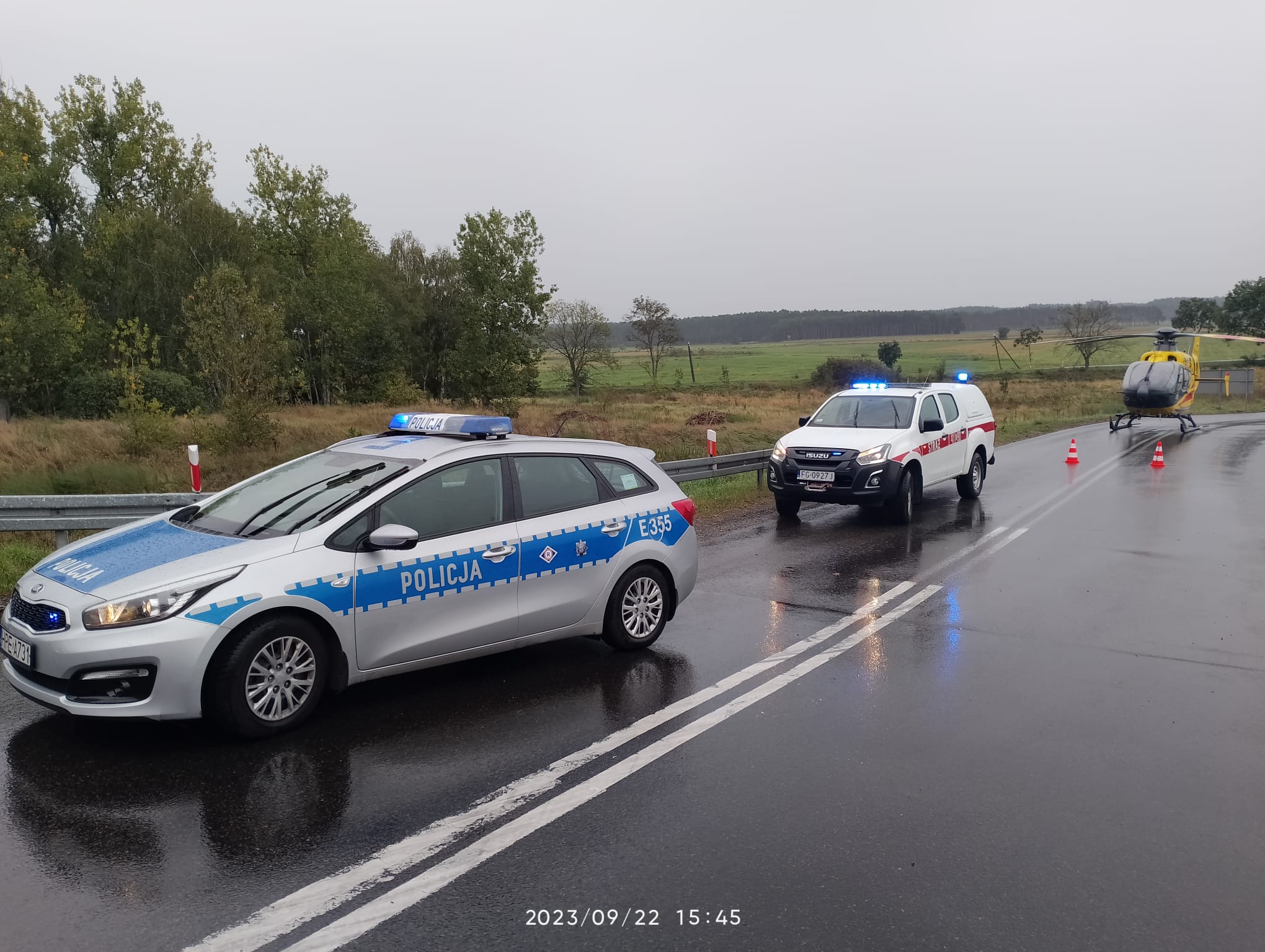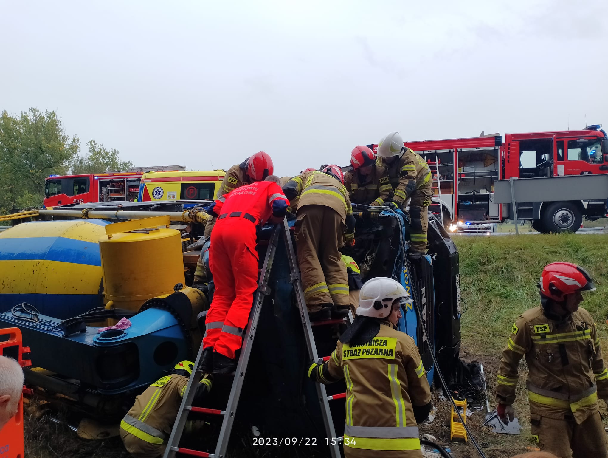 W dniu 22 września br. doszo do zderzenia dwóch samochodów ciężarowych. W skutek zderzenia jeden z nich zjechał z jezdni na pobocze drogi i przewrócił się na bok. Kierujący z urazem kończyny dolnej pozostawał w pojeździe. Działania zastępów polegały na zabezpieczeniu miejsca zdarzenia, wykonaniu dostępu do poszkodowanego przy użyciu sprzętu hydraulicznego, ewakuowaniu go z pojazdu i przekazaniu zespołowi lotniczego pogotowia ratunkowego. W działaniach udział brały zastępy OSP Krzeszyce, OSP Lemierzyce i JRG Sulęcin.