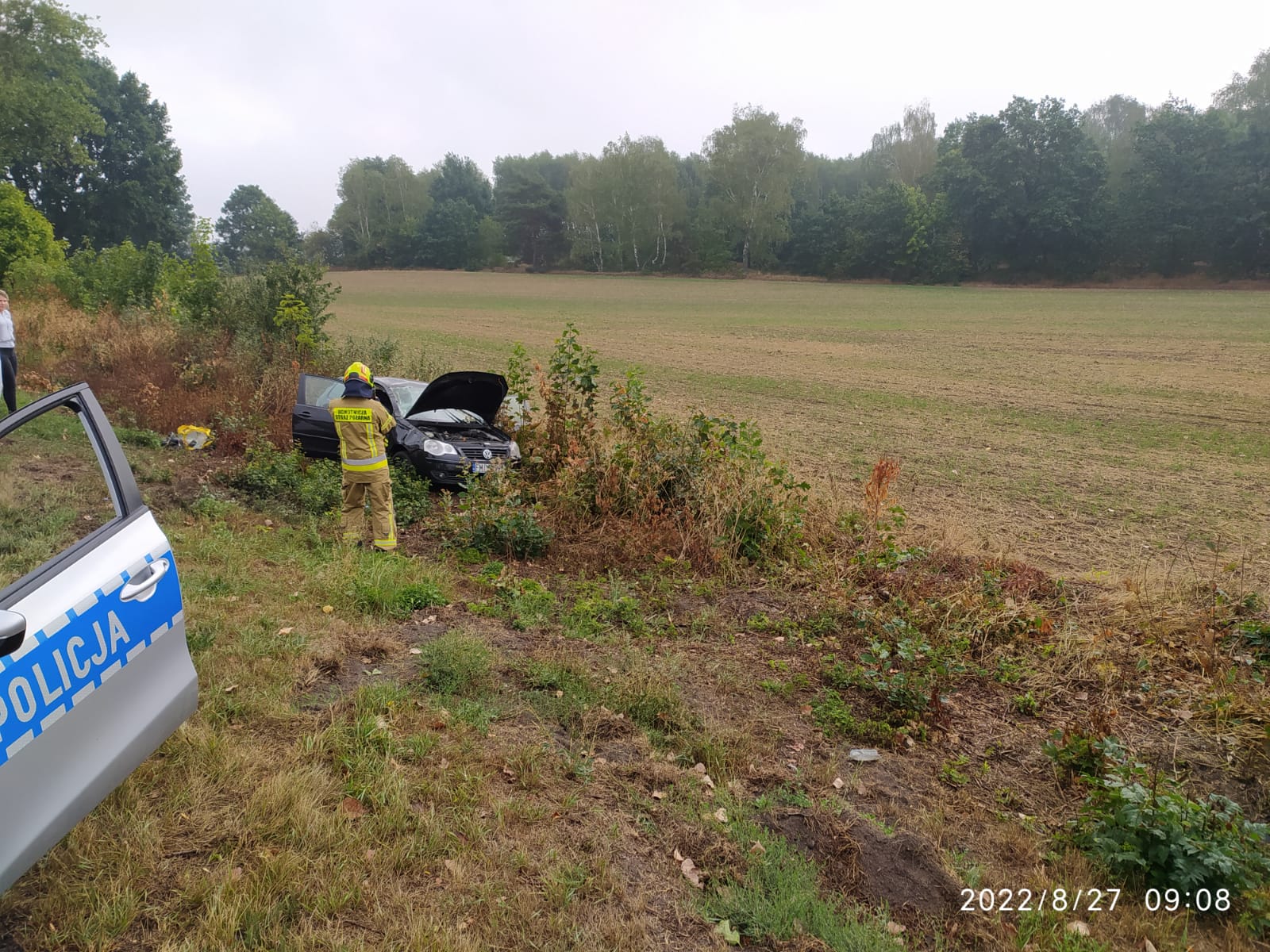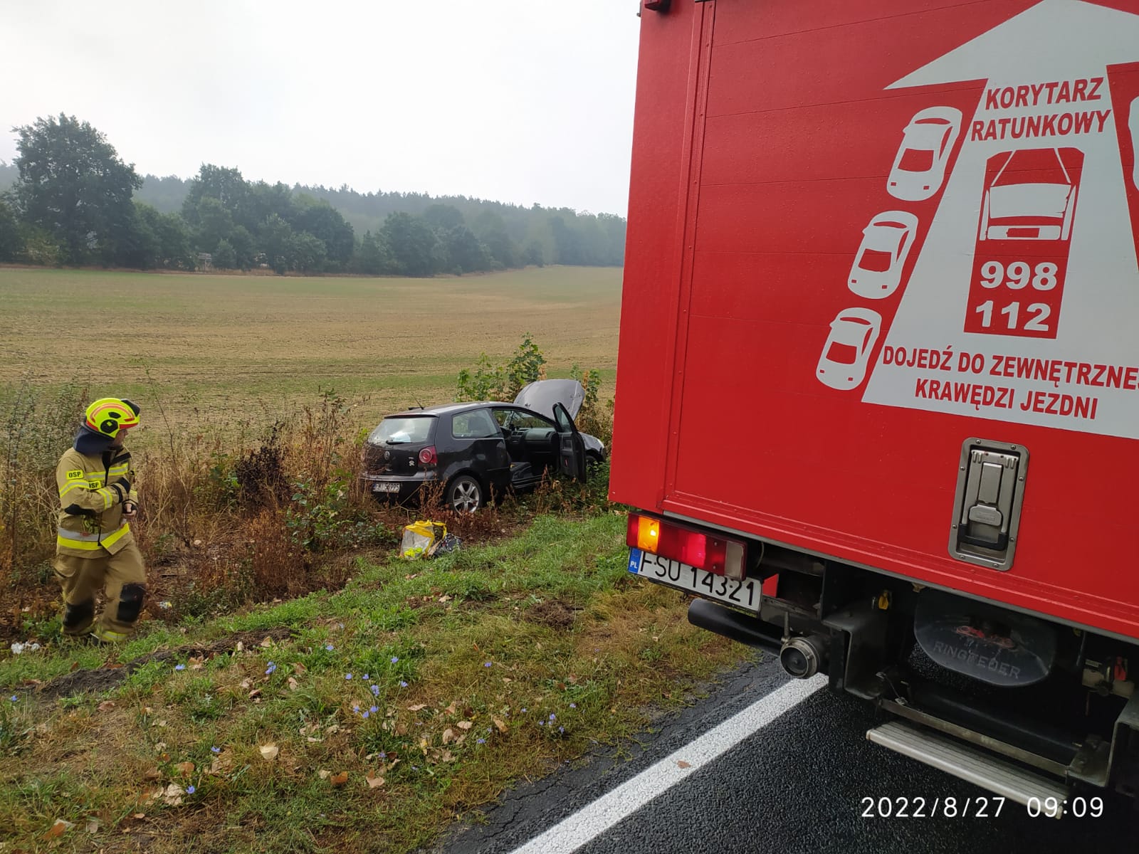 Po dojeździe zastępów na miejsce zdarzenia zastano pojazd osobowy po dachowaniu, stojący na kołach w rowie. Cztery osoby podróżujące pojazdem znajdowały się poza nim i nie wymagały pomocy medycznej. Zamiarem taktycznym KDR było zabezpieczenie miejsca zdarzenia i zabezpieczenie pojazdu pod kątem przeciwpożarowym. W działanich udział brały zastępy z OSP w Torzymiu i JRG w Sulęcinie.