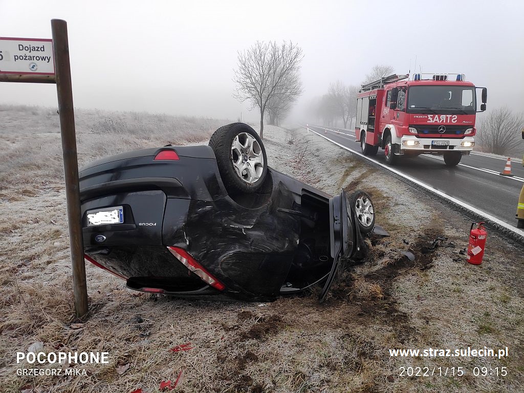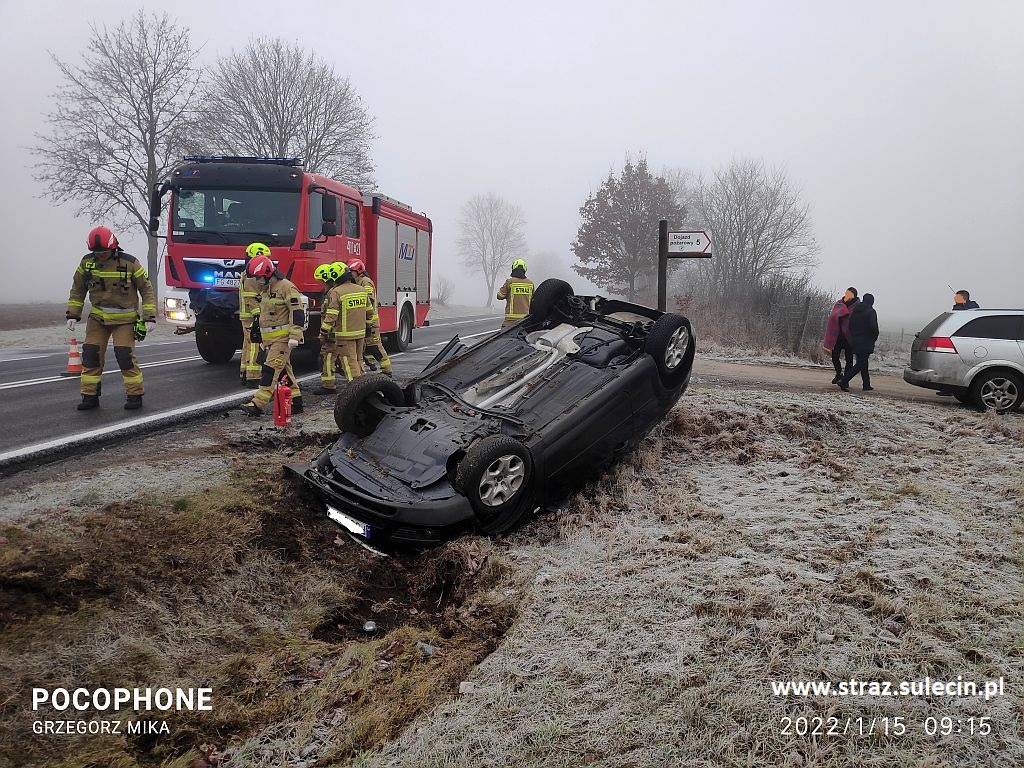 W dniu 15.01.2022r. na trasie z Sulęcina do Torzymia doszło do kolizji drogowej. Po przyjeździe na miejsce zdarzenia okazało się że samochód jest w rowie na dachu. Nikt nie ucierpiał. Działania zastępów z JRG w Sulęcinie oraz OSP w Torzymiu polegały na zabezpieczeniu miejsca zdarzenia.
