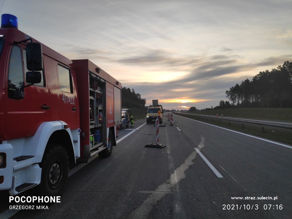 W dniu 03.10.2021 r. około godz. 06:53 na Autostradzie A2 miało miejsce zdarzenie drogowe. W działaniach brały udział zastępy z Jednostki Ratowniczo Gaśniczej w Sulęcinie oraz OSP Torzym. Zastęp OSP Trzebów stanowił odwód operacyjny. Stacjonował w KP PSP Sulęcin do czasu zakończenia działań i powrotu zastępów do bazy.