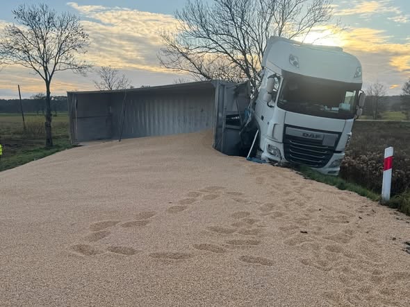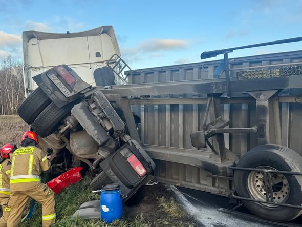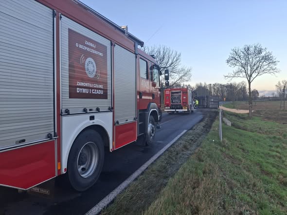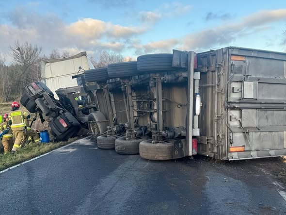 Wywrócona naczepa samochodu ciężarowego, przewożony materiał wysypany na drogę, rozszczelniony zbiornik i wyciek paliwa. Na miejscu zdarzenia zastępy z JRG Sulęcin i OSP Krzeszyce.