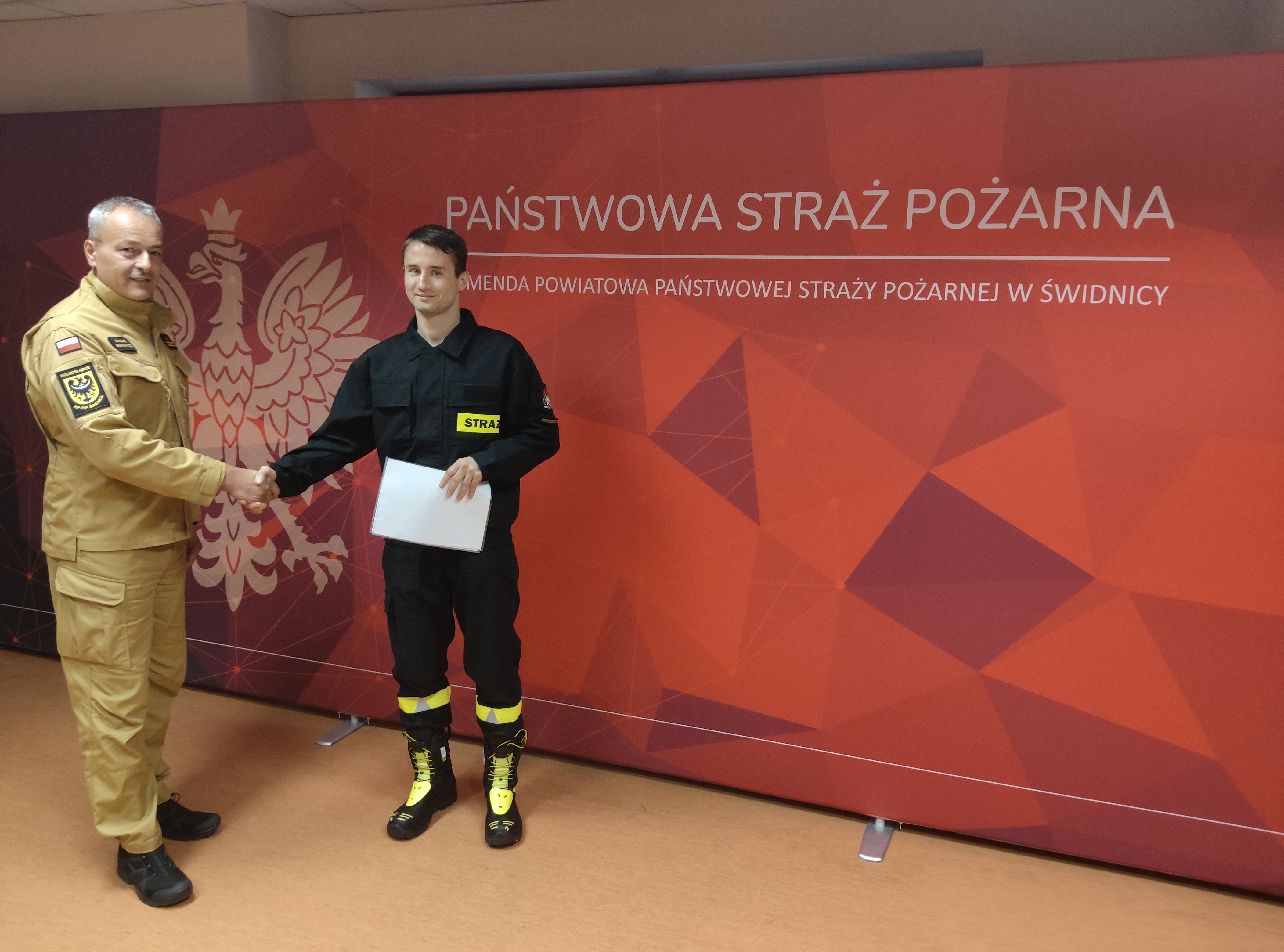 Komendant Powiatowy PSP w Świdnicy bryg. Dariusz Budkiewicz uroczyście wręczył mianowanie nowemu strażakowi na stanowisko stażysty.