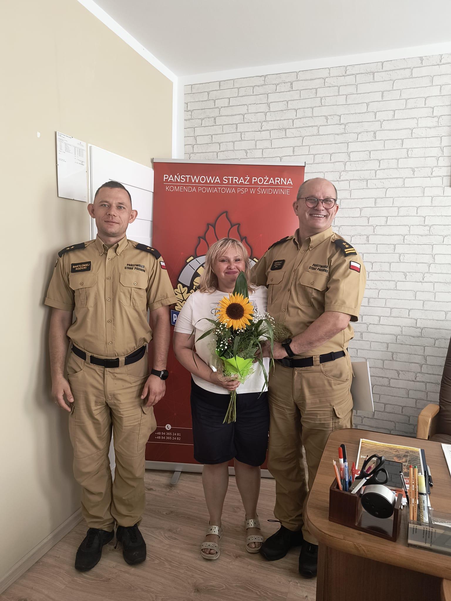 10 lipca 2024 r. Komendant Powiatowy Państwowej Straży Pożarnej w Świdwinie bryg. Mirosław Niezgoda, wręczył nagrodę jubileuszową za 25 lat pracy dla Wiolety Nawodzińskiej.