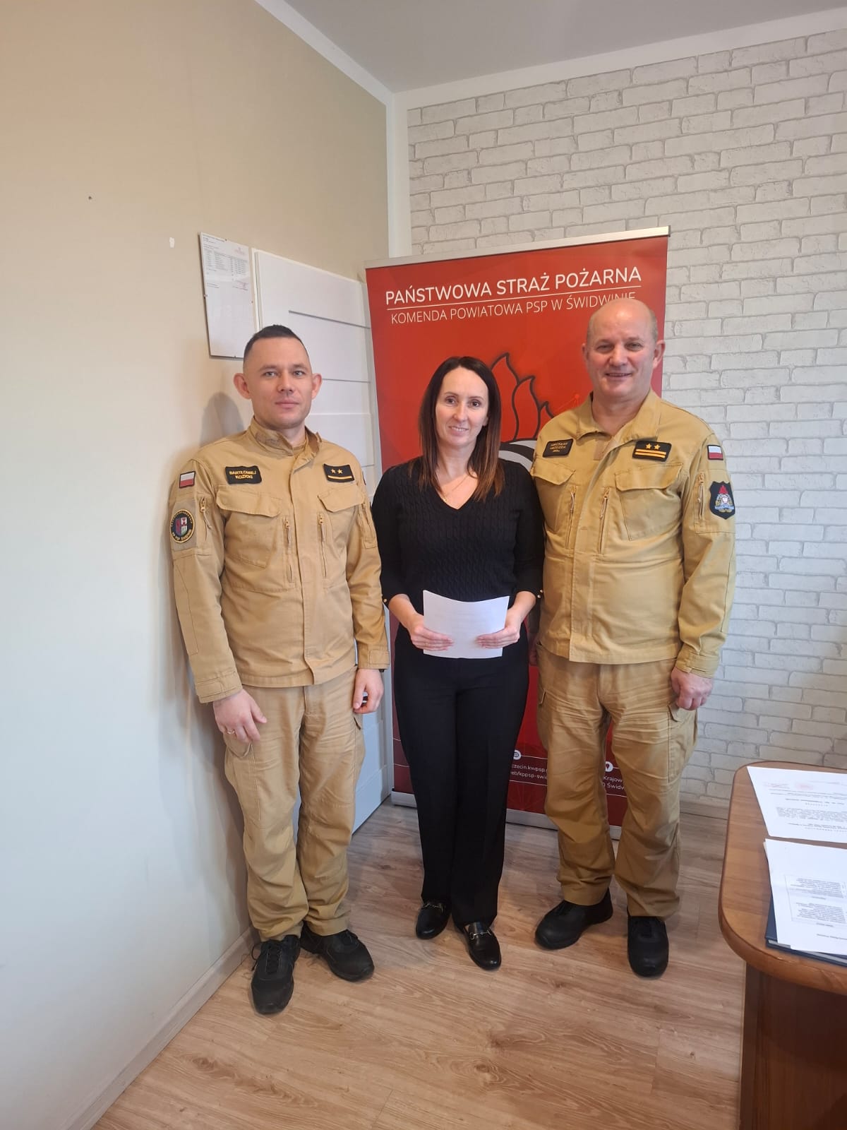 08 listopada 2024r. Komendant Powiatowy Państwowej Straży Pożarnej w Świdwinie bryg. Mirosław Niezgoda, wręczył nagrodę jubileuszową za 30 lat pracy Edycie Grzystek, głównej księgowej w KP PSP Świdwin.