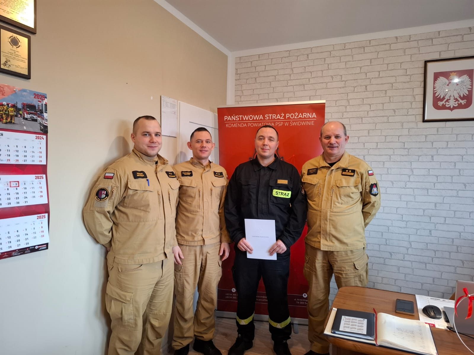 02 stycznia 2025 r. Komendant Powiatowy Państwowej Straży Pożarnej w Świdwinie bryg. Mirosław Niezgoda, wręczył akt mianowania na stanowisko służbowe dla st. sekc. Tomasza Kowalczyka, zajmującego od stycznia stanowisko dyżurny stanowiska kierowania.