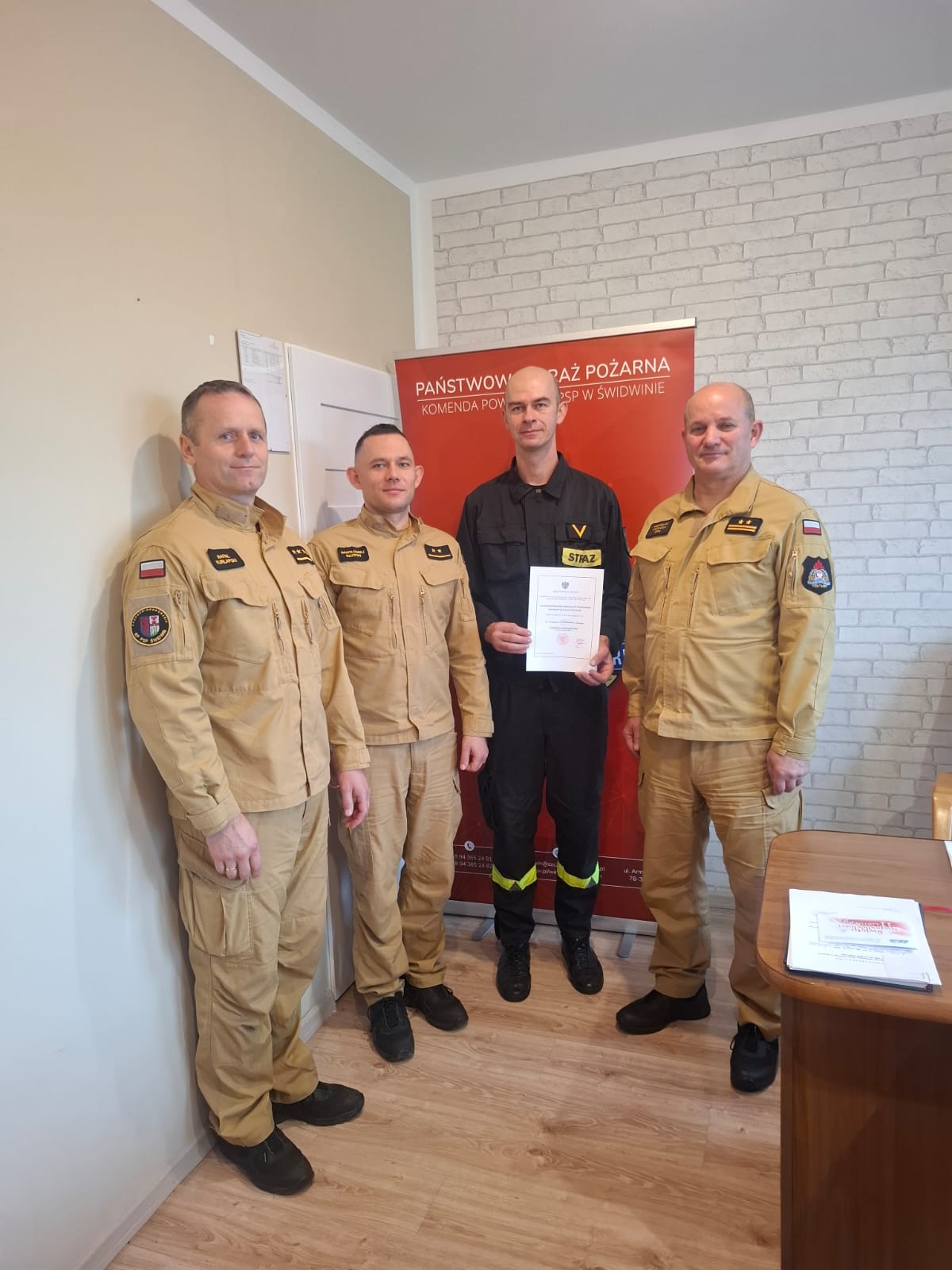 08 listopada 2024 roku Komendant Powiatowy Państwowej Straży Pożarnej w Świdwinie bryg. Mirosław Niezgoda wręczył rozkaz personalny Komendanta Wojewódzkiego Państwowej Straży Pożarnej st. bryg. Mirosława Pendera z dnia 11 listopada 2024 r. o nadaniu ogniomistrzowi Grzegorzowi Dunderowi stopienia starszego ogniomistrza.