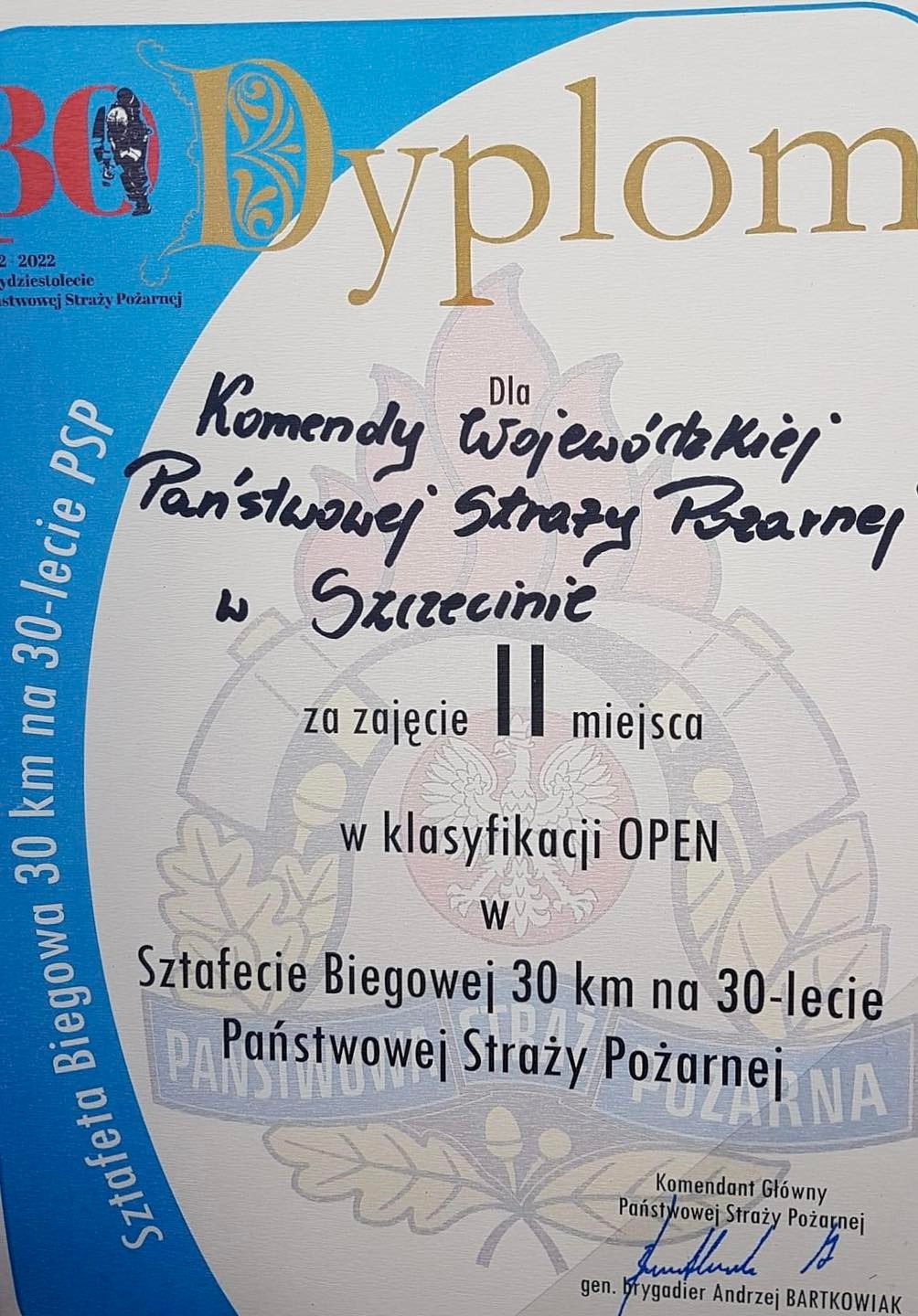 26 maja 2022 r. na torze Automobilklubu Poznańskiego „Tor Poznań”, odbył się bieg sztafetowy „30 kilometrów na 30-lecie Państwowej Straży Pożarnej. W wydarzeniu rywalizowało 26 drużyn strażackich reprezentujących Komendę Główną PSP, komendy wojewódzkie PSP oraz szkoły pożarnicze. W kategorii open reprezentacja z Komendy Wojewódzkiej Państwowej Straży Pożarnej w Szczecinie zajęła II miejsce.