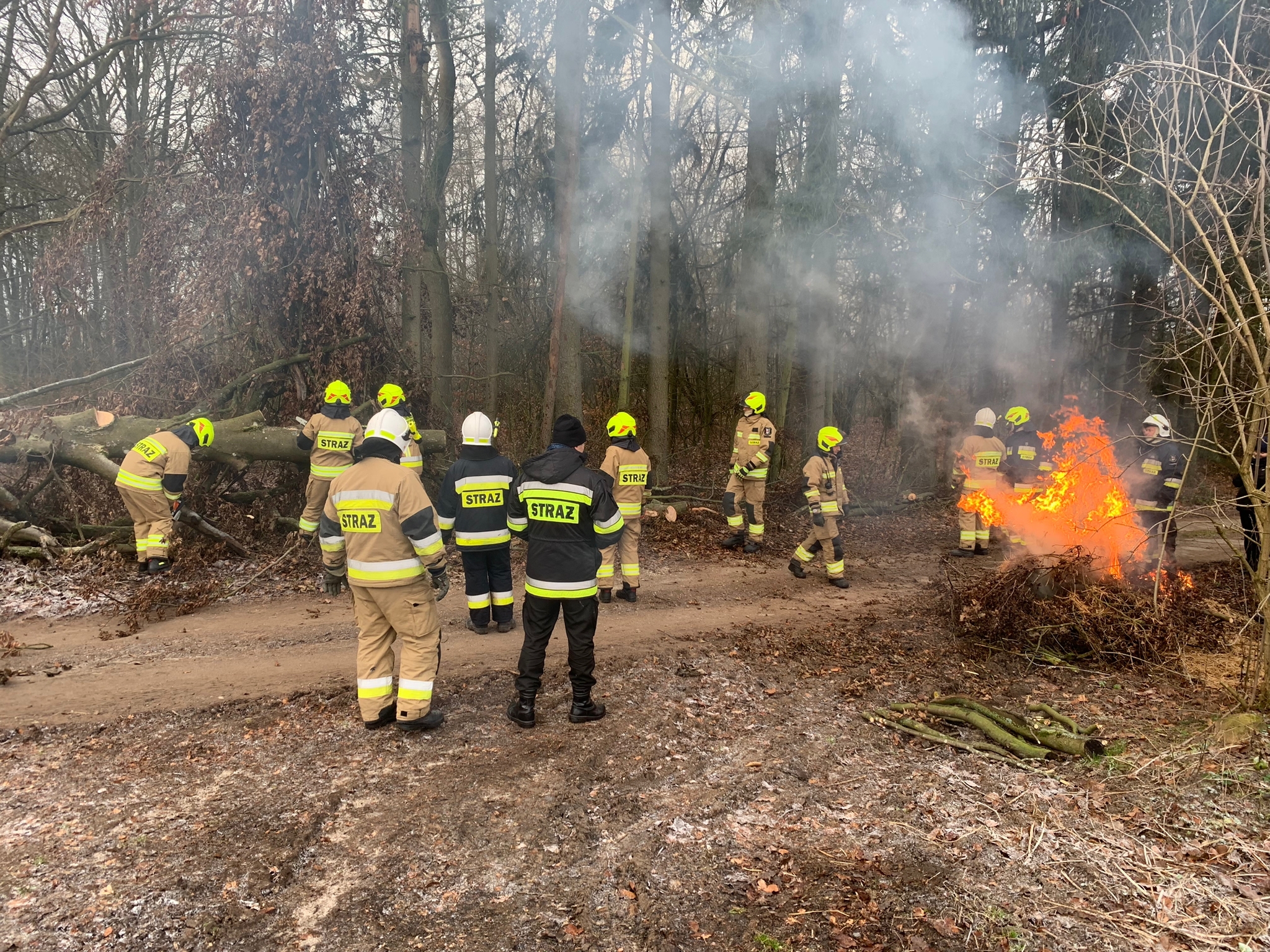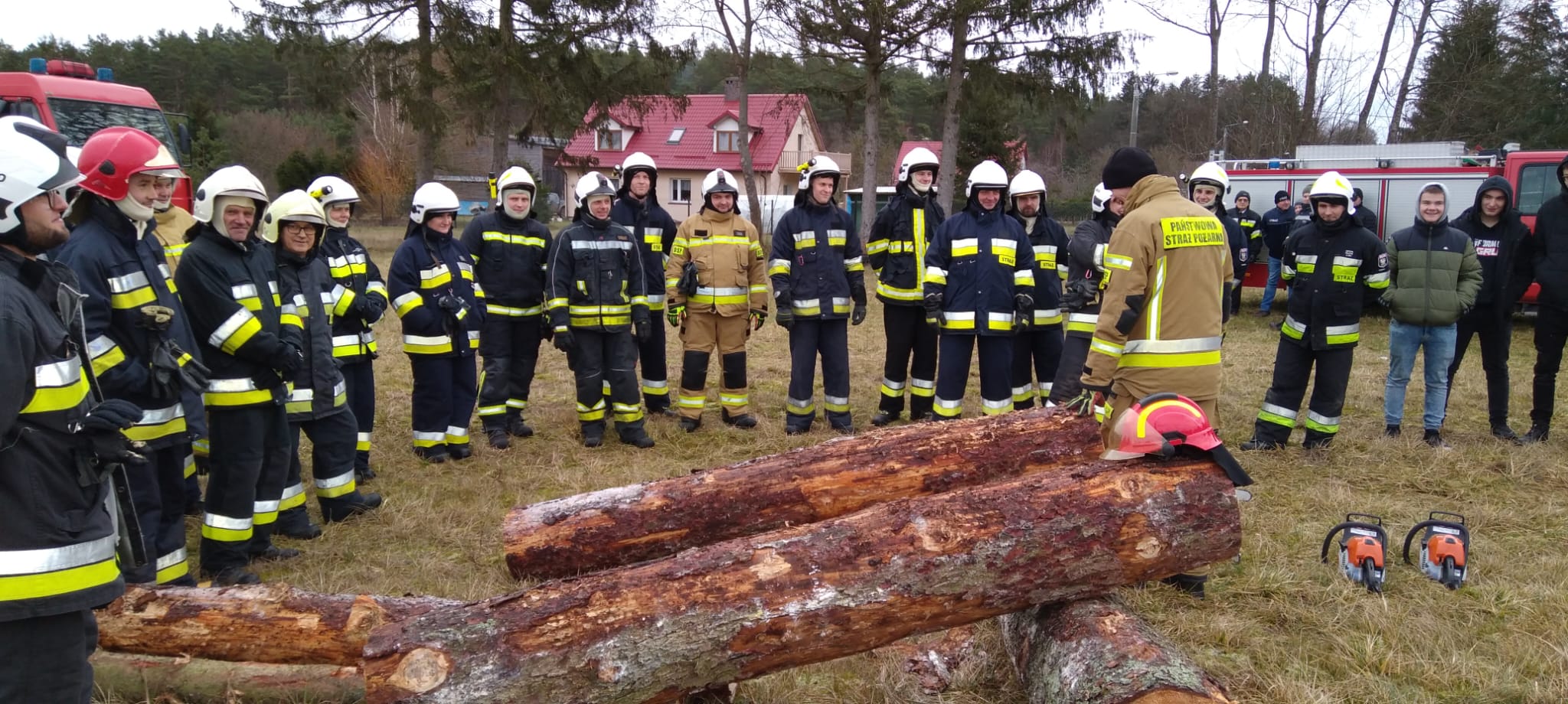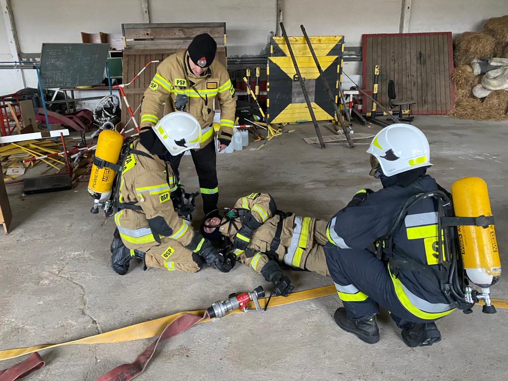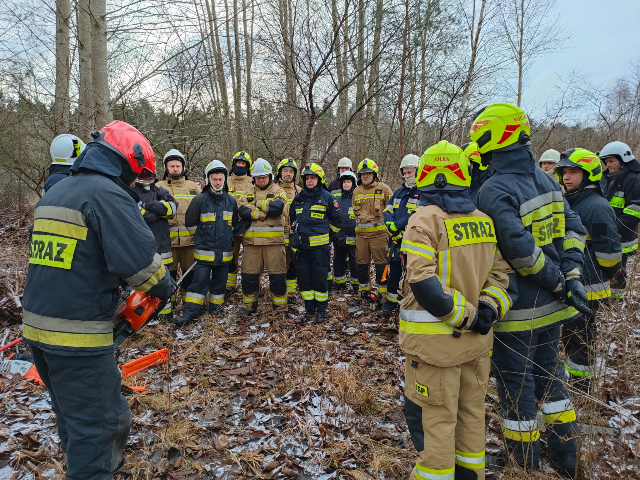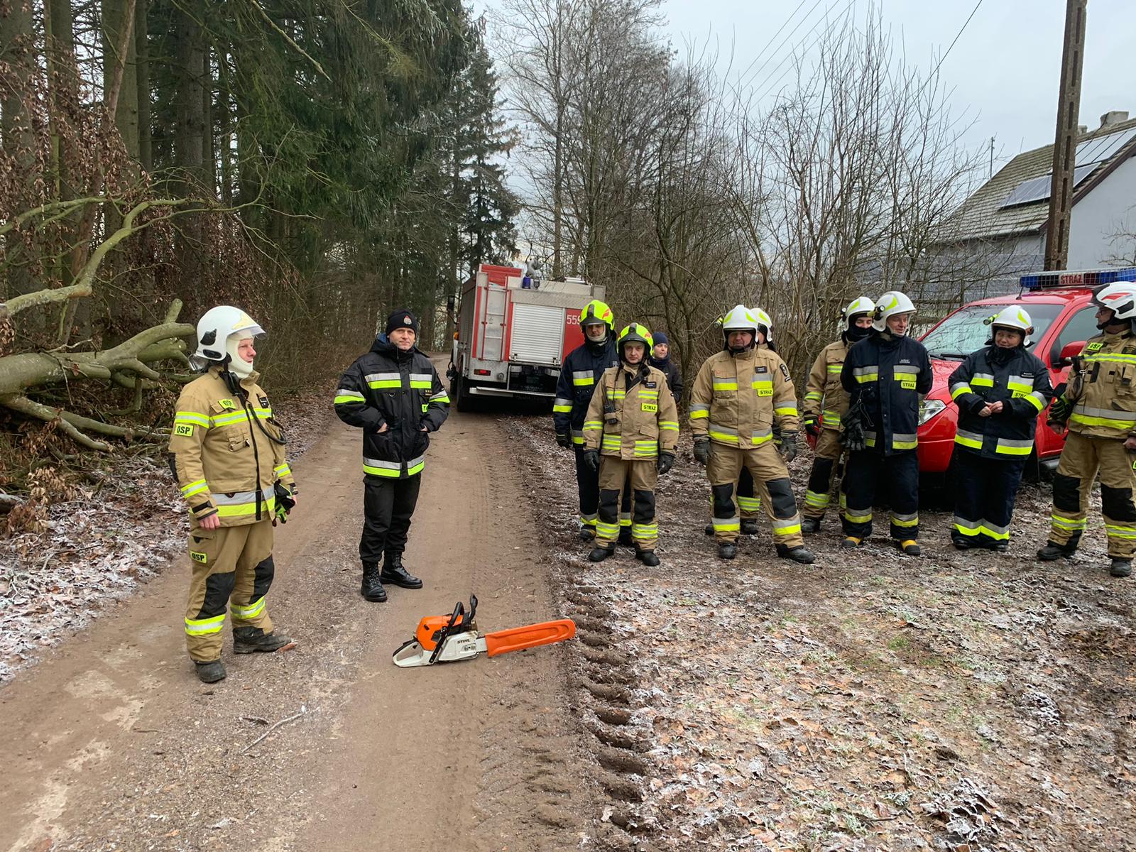 Drugim etapem ćwiczeń były ćwiczenia praktyczne, przeprowadzone na terenie leśnictwa Karsibór, w dniu 17 stycznia 2023 roku. Wzięli w nich udział strażacy OSP z Gminy Brzeżno oraz strażacy z Jednostki Ratowniczo-Gaśniczej w Świdwinie. Zajęcia z tematyki ratowniczego sprzęt mechanicznego (pilarki spalinowe) zostały przeprowadzone we współpracy z Nadleśnictwem Świdwin (reprezentowaną przez Panią Beatę Zbonikowską) oraz leśniczego Karsiboru i zarazem instruktora przedmiotowych ćwiczeń Pana Daniela Potejko. Serdecznie dziękujemy za pomoc i realizacje merytorycznych zajęć.