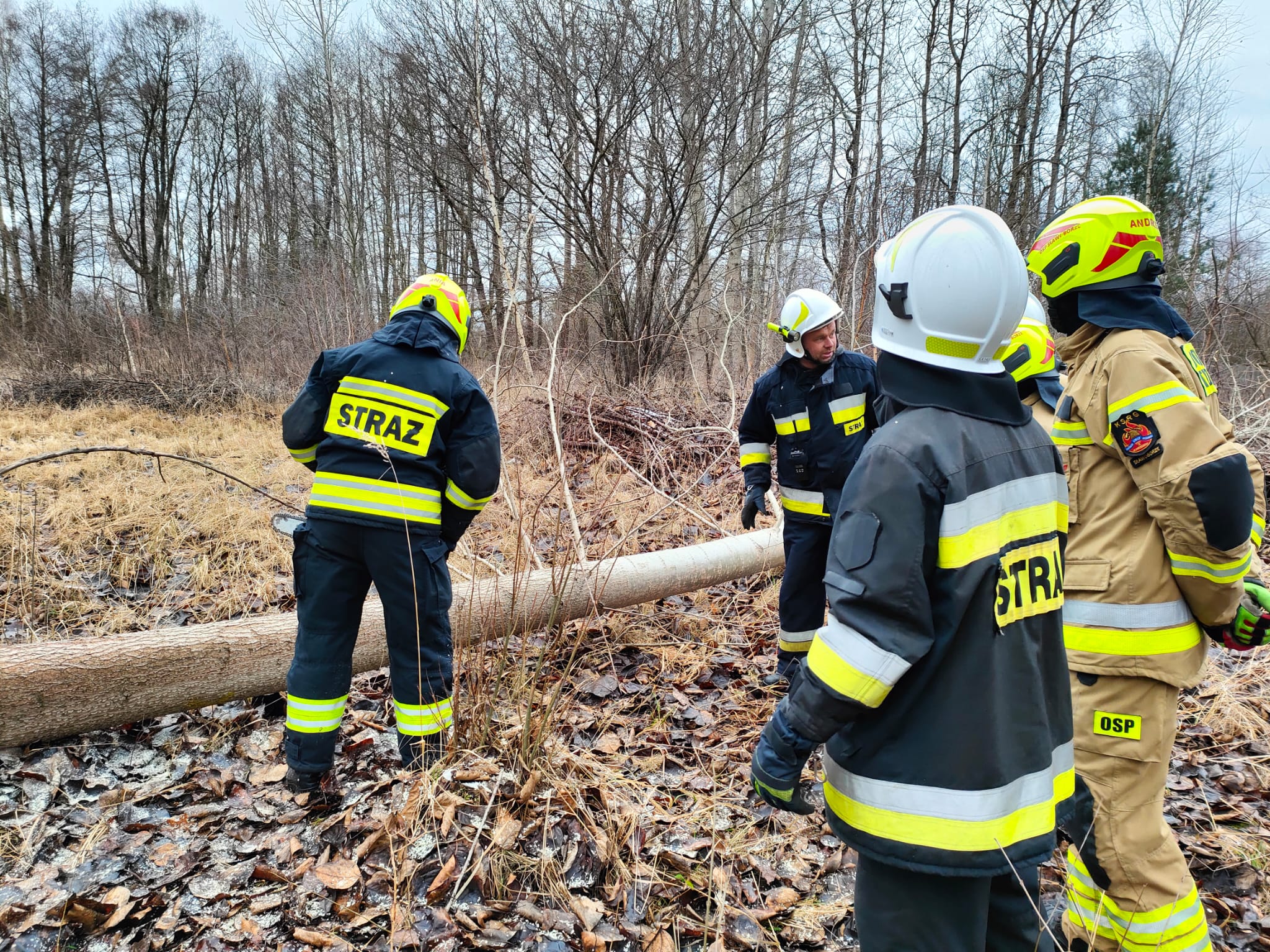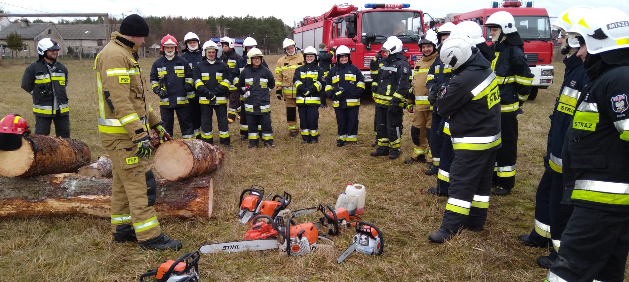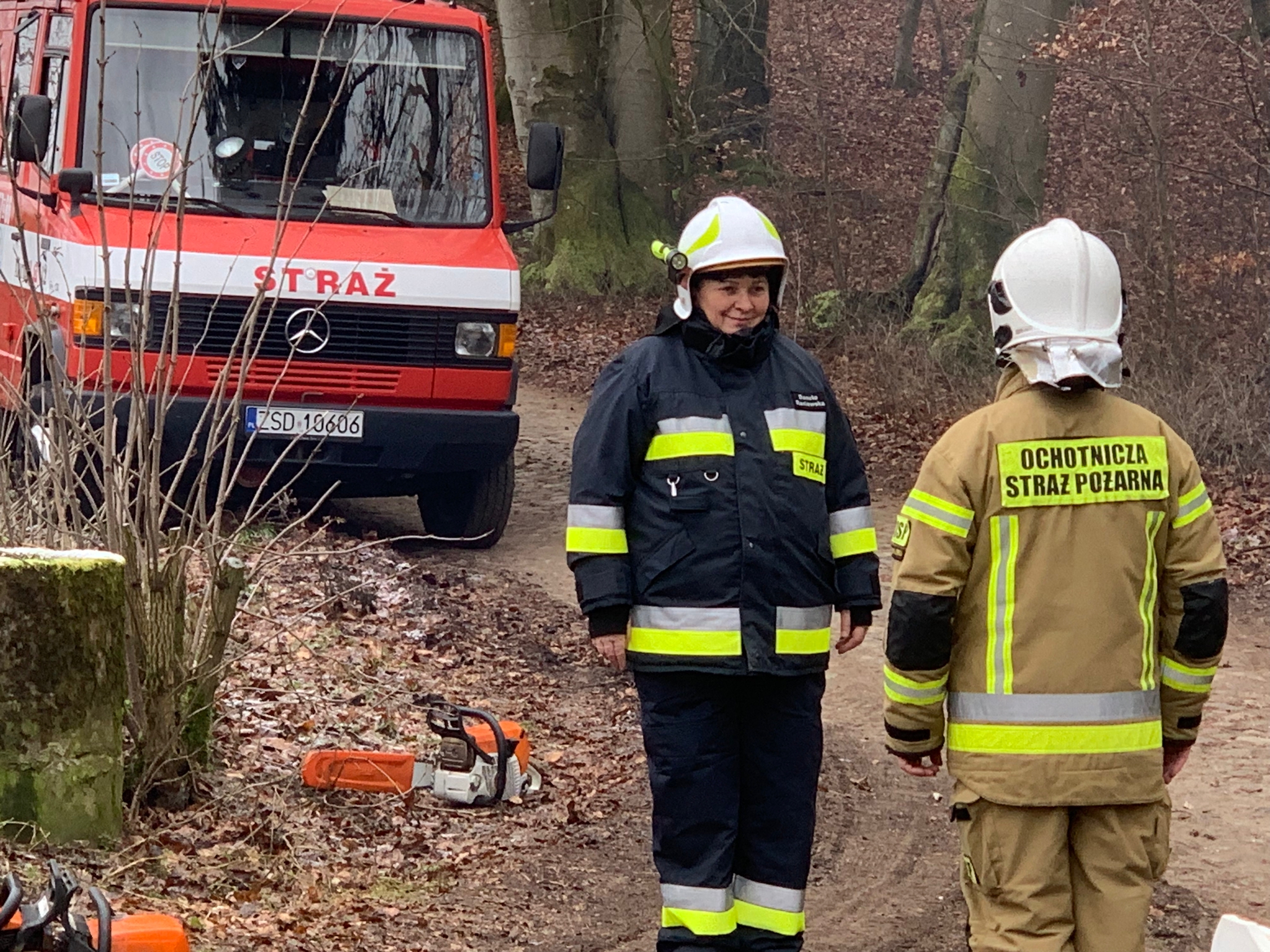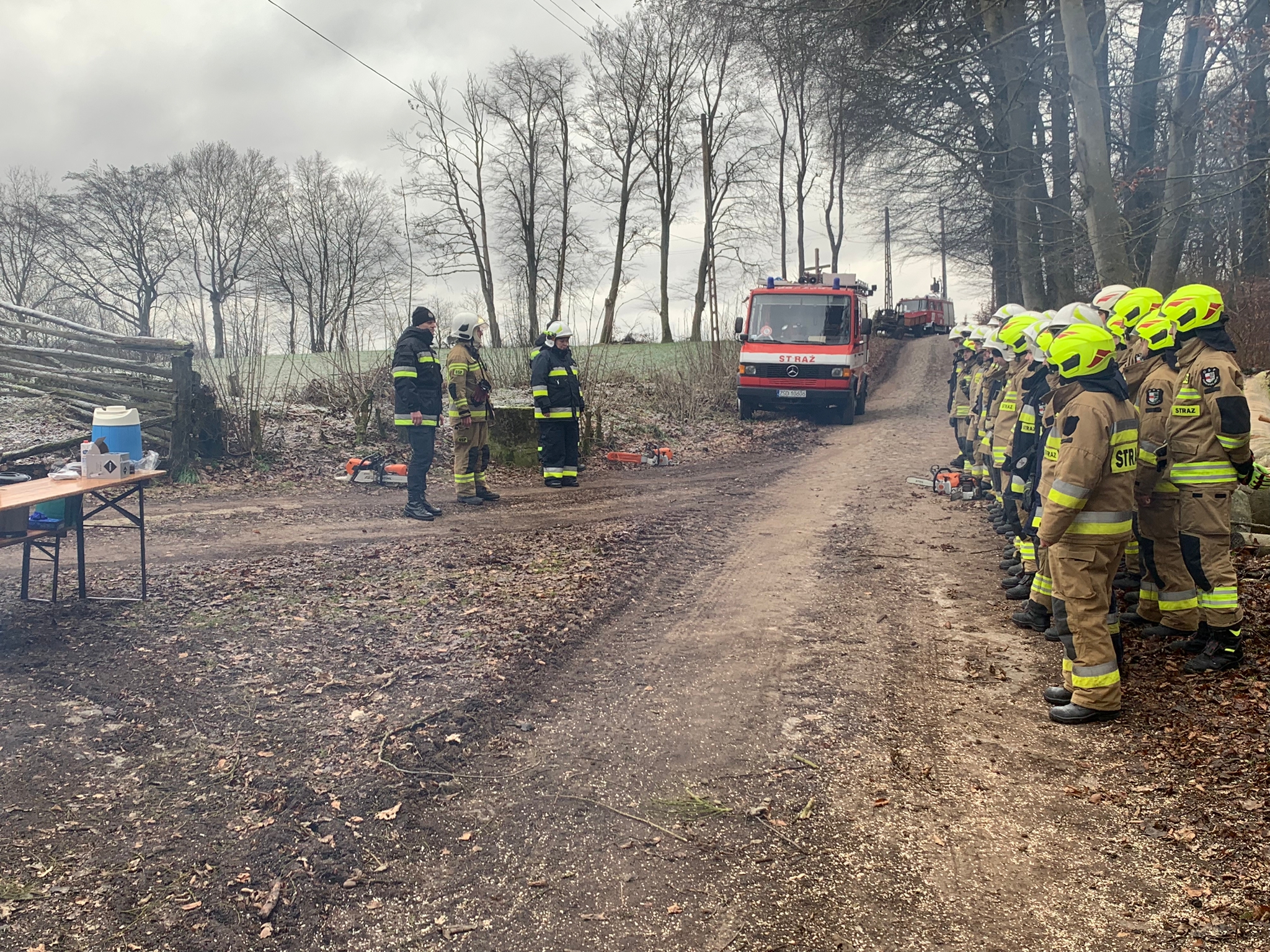 Drugim etapem ćwiczeń były ćwiczenia praktyczne, przeprowadzone na terenie leśnictwa Karsibór, w dniu 17 stycznia 2023 roku. Wzięli w nich udział strażacy OSP z Gminy Brzeżno oraz strażacy z Jednostki Ratowniczo-Gaśniczej w Świdwinie. Zajęcia z tematyki ratowniczego sprzęt mechanicznego (pilarki spalinowe) zostały przeprowadzone we współpracy z Nadleśnictwem Świdwin (reprezentowaną przez Panią Beatę Zbonikowską) oraz leśniczego Karsiboru i zarazem instruktora przedmiotowych ćwiczeń Pana Daniela Potejko. Serdecznie dziękujemy za pomoc i realizacje merytorycznych zajęć.