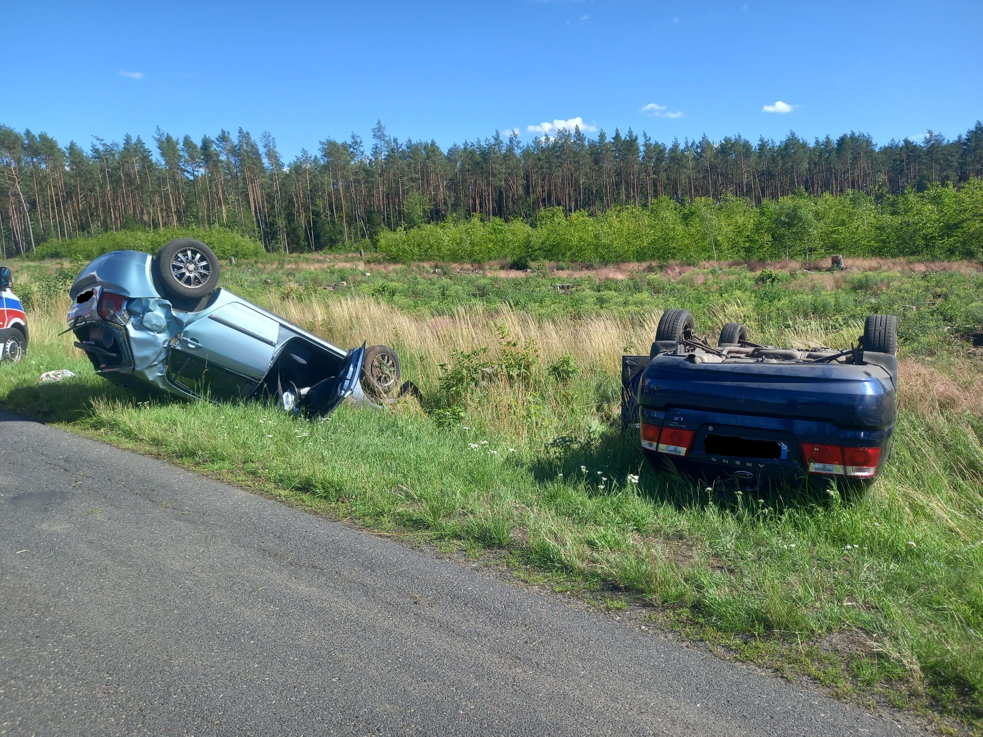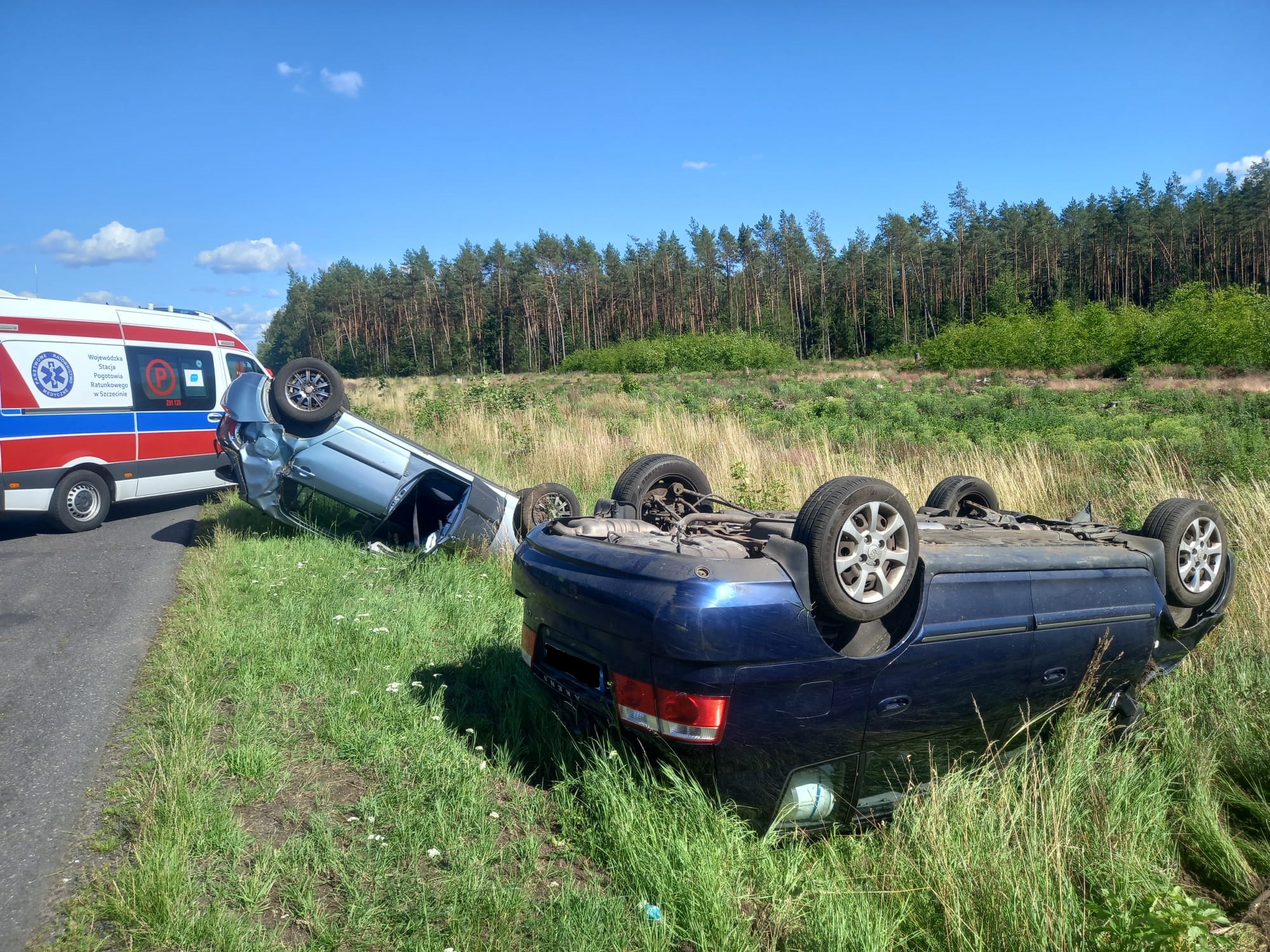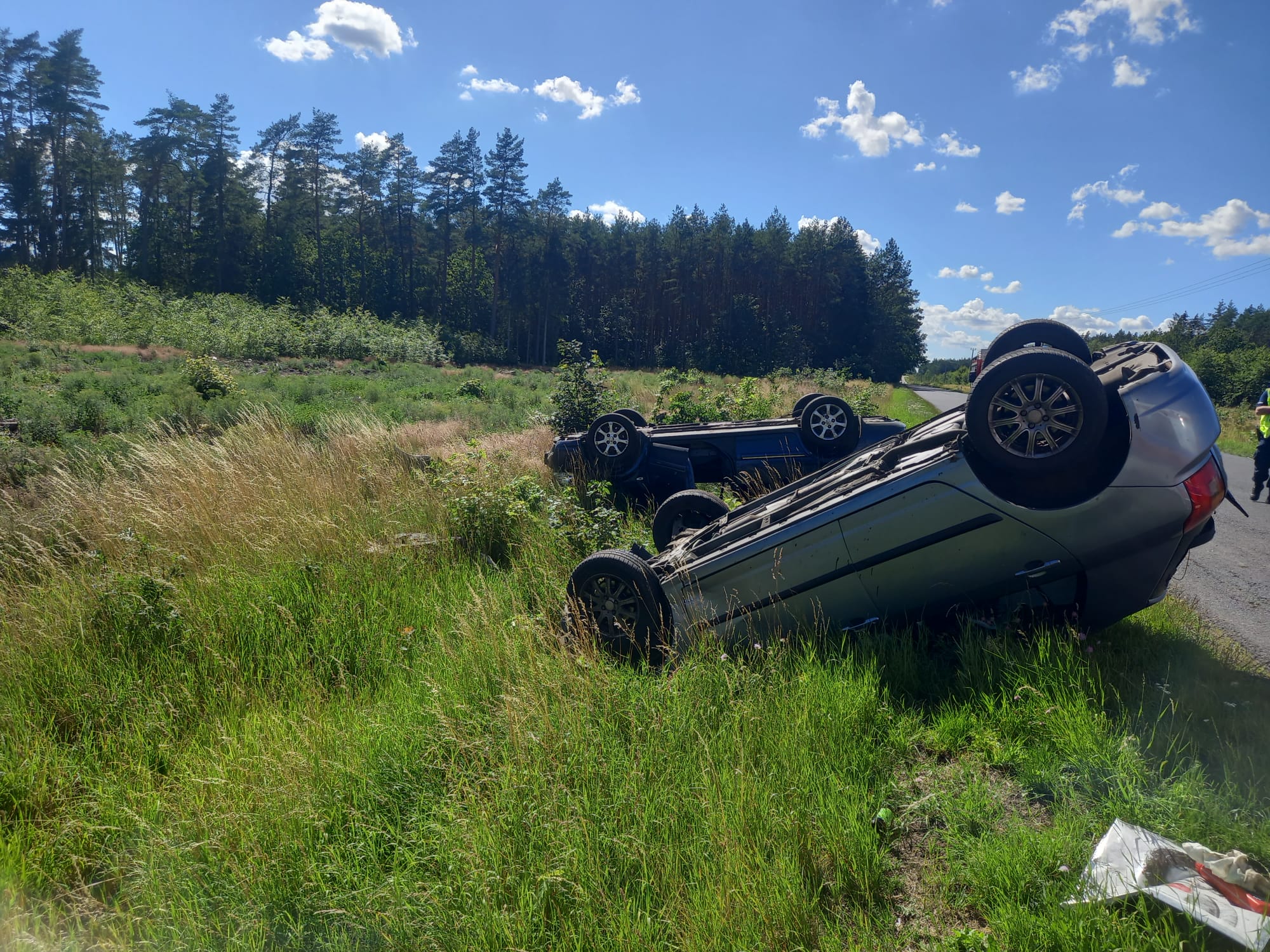 Po przyjeździe na miejsce zdarzenia straży pożarnej zastano dwa samochody osobowe znajdujące się poza jezdnią po wcześniejszym dachowaniu. W zdarzeniu zostały poszkodowane dwie osoby, jedna z nich została przetransportowana przez Zespół Ratownictwa Medycznego do szpitala.