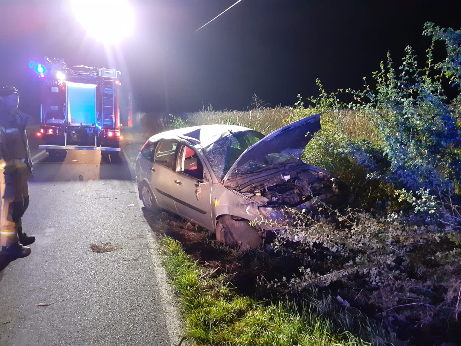 Po przyjeździe na miejsce zdarzenia pierwszych zastępów straży pożarnej okazało się, że samochód osobowy znajduję się na poboczu jezdni po wcześniejszym dachowaniu. Pojazdem podróżowała jedna osoba, która samodzielnie opuściła pojazd przed przybyciem służb ratunkowych.