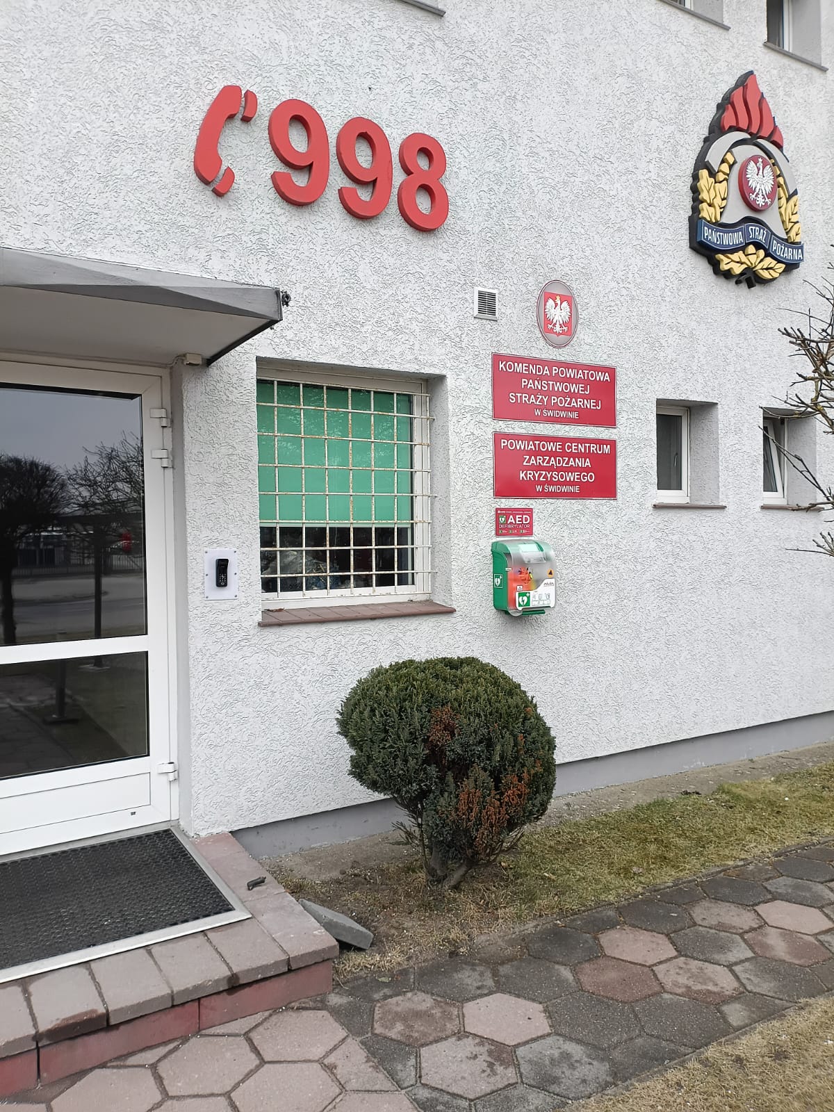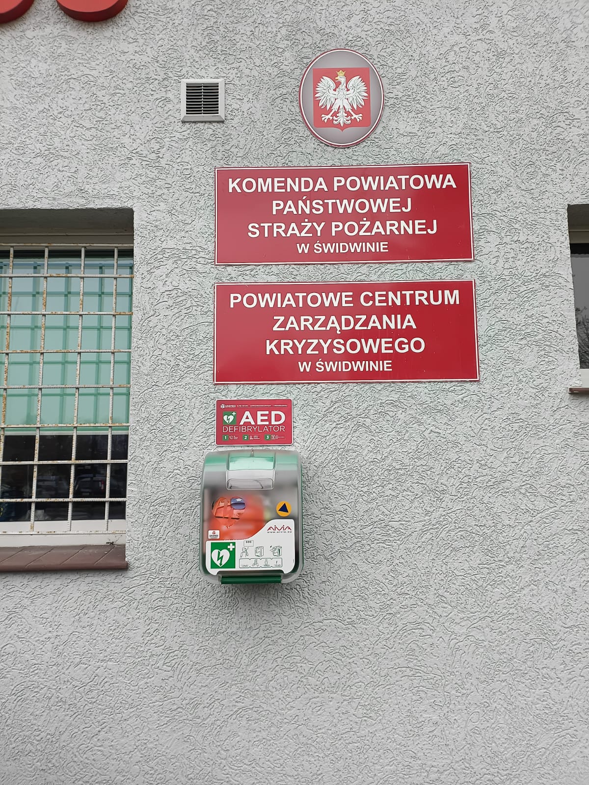 Defibrylator AED przed wejściem do KP PSP w Świdwinie - może uratować życie