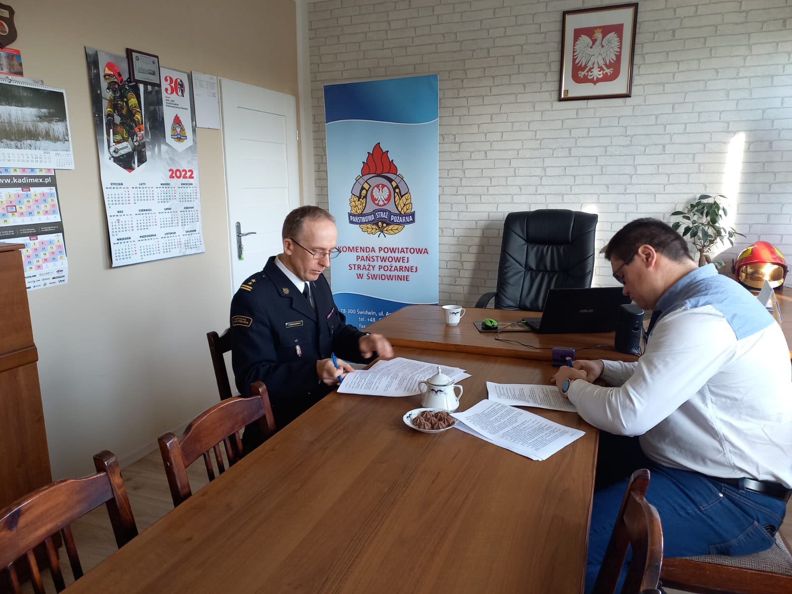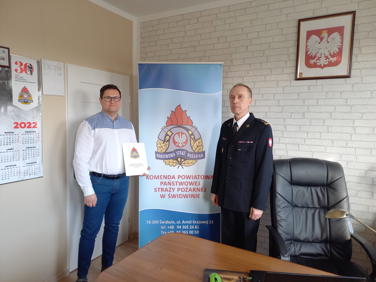 Podpisania umowy dokonali właściciel firmy DYNAMIC-BUD Pan Radosław Krzymiński oraz Komendant Powiatowy Państwowej Straży Pożarnej w Świdwinie bryg. Józef Brzeziński.