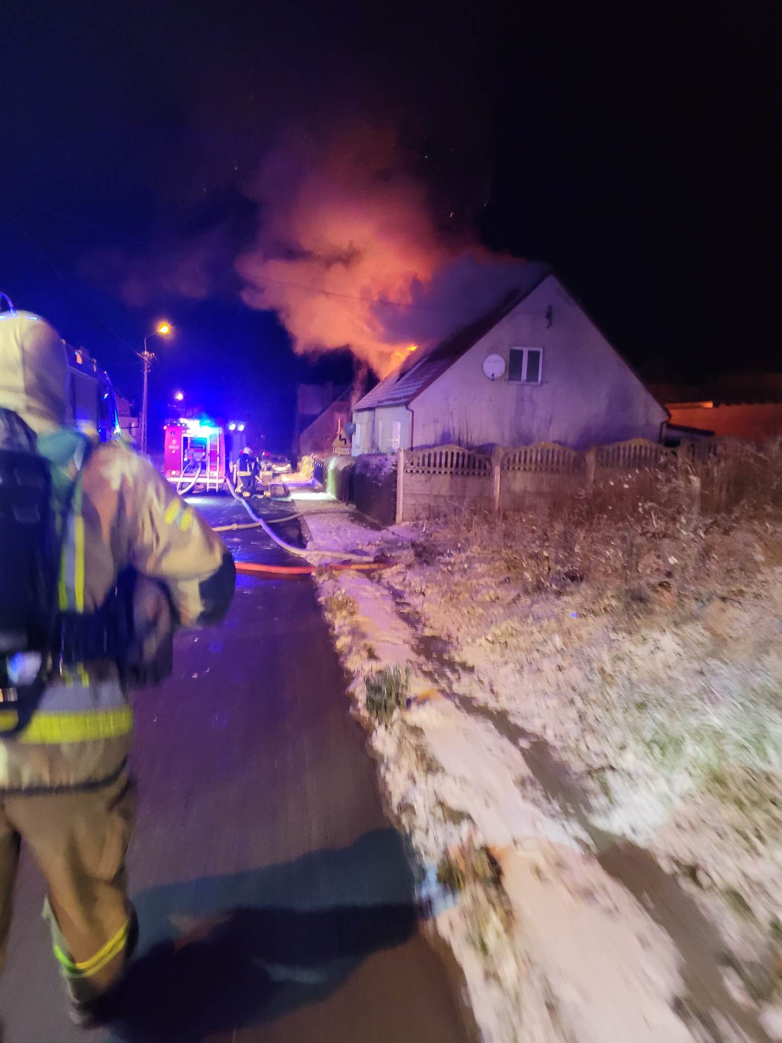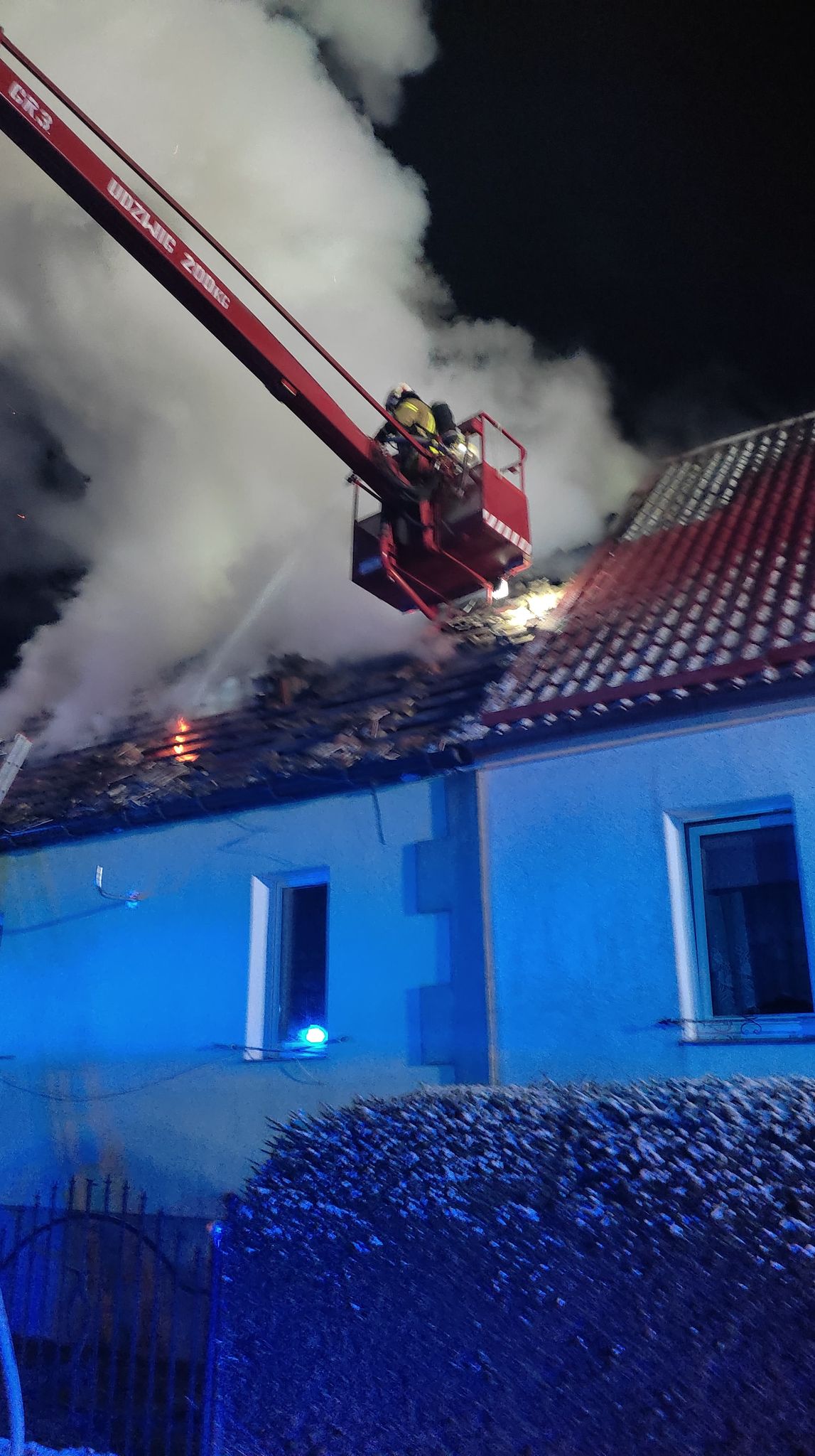 Po dojeździe na miejsce zdarzenia zastępów straży pożarnej, zastano połowę dachu objętego ogniem w budynku mieszkalnym dwurodzinnym. Mieszkańcy opuścili samodzielnie budynek przed przybyciem służb ratowniczych.