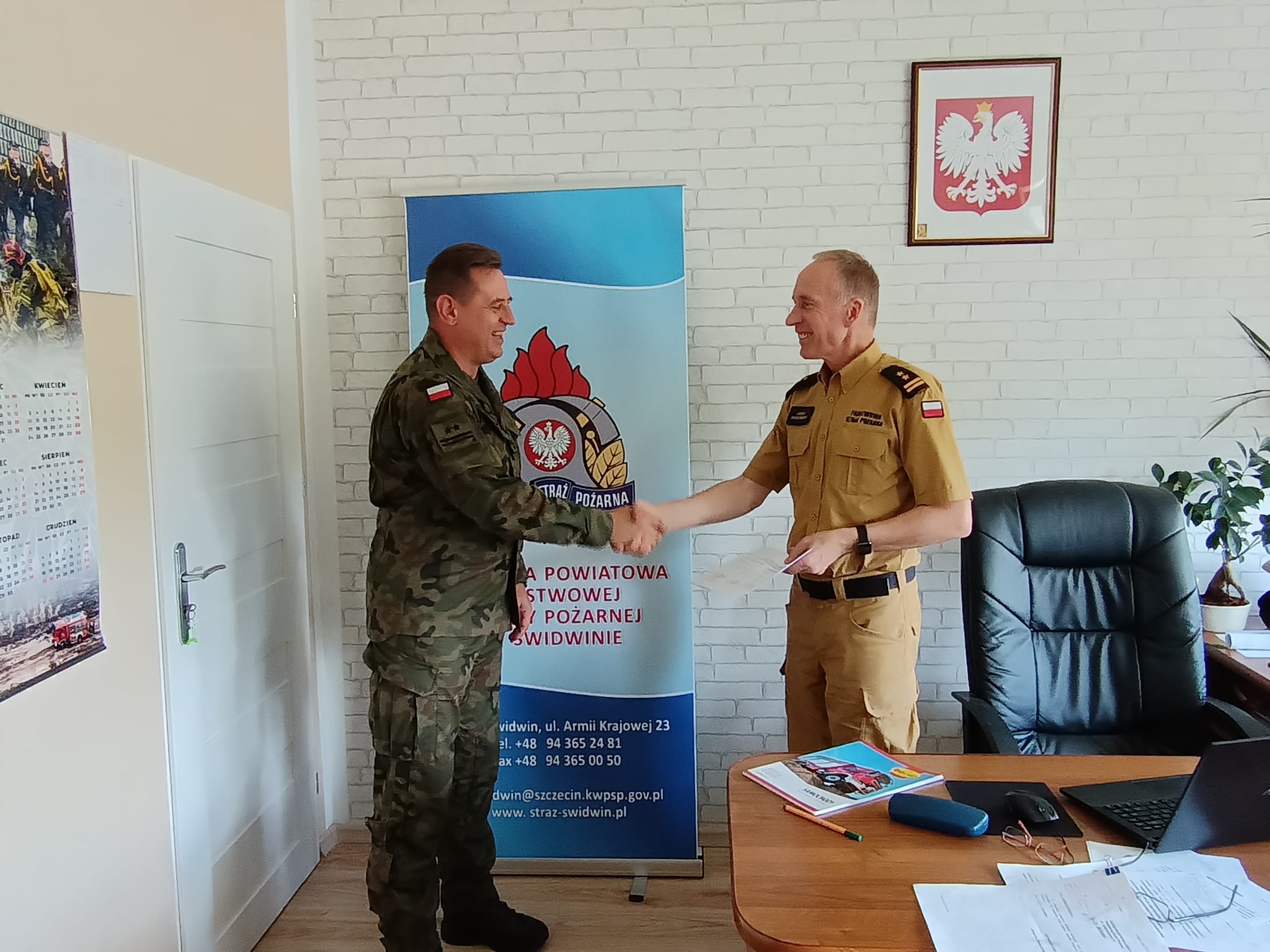 24 sierpnia 2023 r. w Komendzie Powiatowej Państwowej Straży Pożarnej w Świdwinie odbyło się spotkanie z przedstawicielami Wojskowej Straży Pożarnej w Świdwinie. W spotkaniu uczestniczyli: ppłk Robert Grelowski – Szef Delegatury Wojskowej Ochrony Przeciwpożarowej w Szczecinie, st. kpt. Wojciech Makutynowicz – Główny Specjalista w Delegaturze Wojskowej Ochrony Przeciwpożarowej w Szczecinie, mł. chor. Robert Moskalczyk – Komendant Wojskowej Straży pożarnej 21 BLT w Świdwinie, bryg. Józef Brzeziński – Komendant Powiatowy Państwowej Straży Pożarnej w Świdwinie, bryg. Mirosław Niezgoda – Zastępca Komendanta Powiatowego Państwowej Straży Pożarnej w Świdwinie. Celem zasadniczym rozmów było uzgodnienie obszarów współpracy pomiędzy KP PSP Świdwin, a Wojskową Strażą Pożarną 21. Bazy Lotnictwa Taktycznego w Świdwinie.