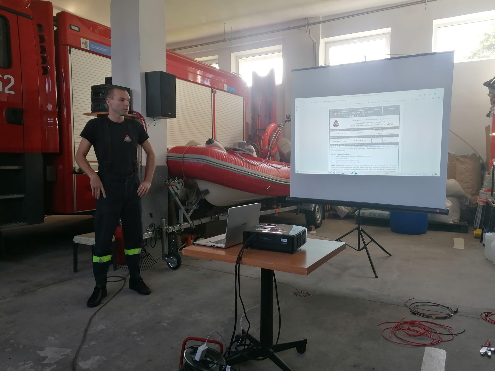 7 oraz 8 września 2021 r. w jednostce Ochotniczej Straży Pożarnej w Połczynie-Zdroju odbył się cykl szkoleń poświęcony instalacji fotowoltaicznych. W części teoretycznej przedstawiono budowę i zasadę działania instalacji fotowoltaicznej oraz najczęstsze przyczyny powstania pożarów. Bardzo istotnym elementem wykładu było zwrócenie szczególnej uwagi na zagrożenia, z którymi strażak może mieć do czynienia podczas prowadzenia działań ratowniczo-gaśniczych.