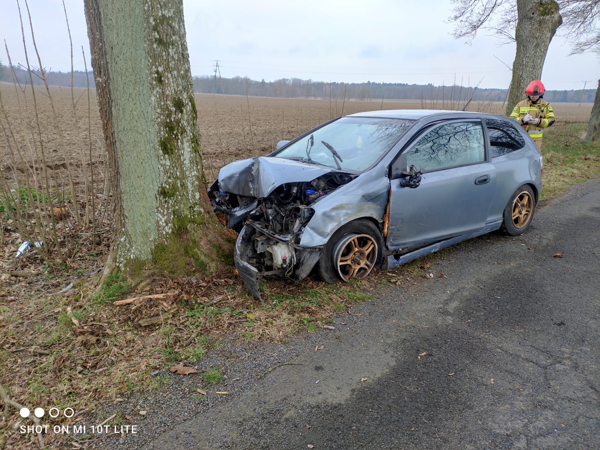 Po przyjeździe na miejsce zdarzenia straży pożarnej zastano samochód po wcześniejszym uderzeniu w drzewo. Kierowca znajdował się po za pojazdem.