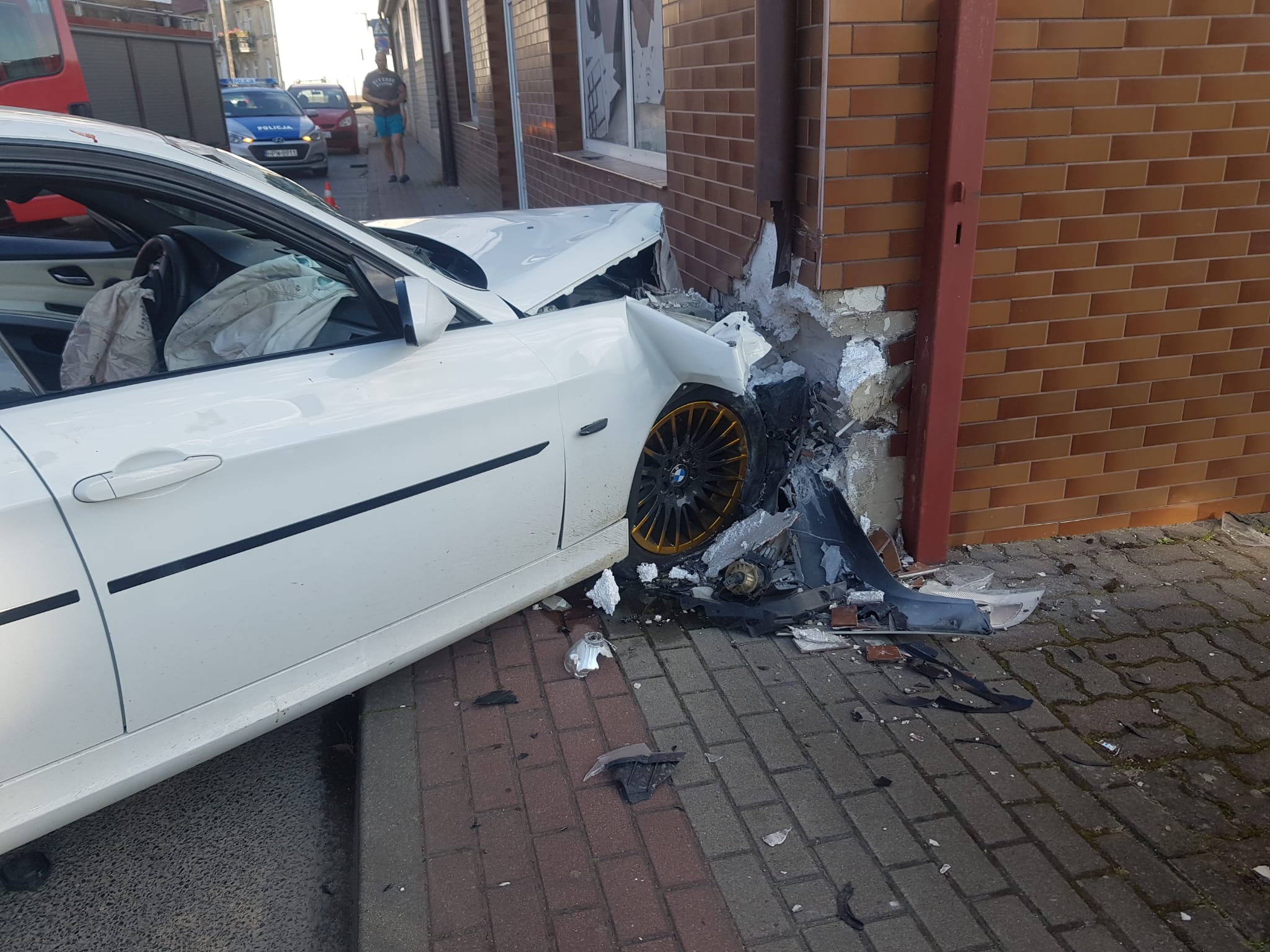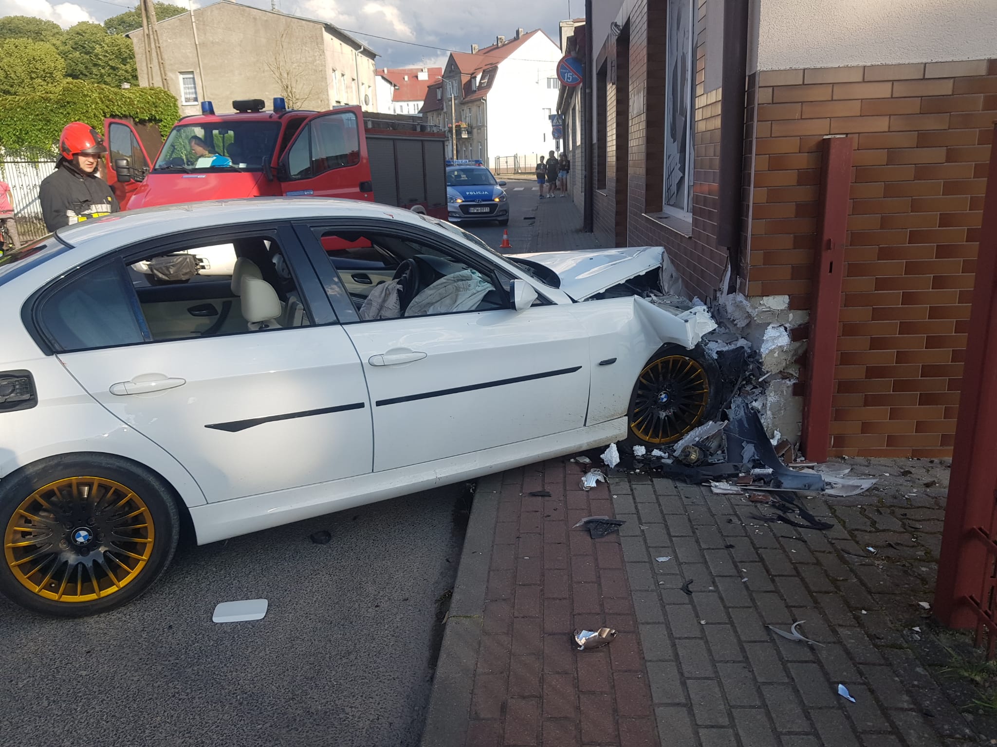 Po przyjeździe na miejsce zdarzenia straży pożarnej zastano samochód osobowy marki BMW, który uderzył przodem w róg budynku. Kierowca samochodu osobowego oraz pasażer znajdował się poza pojazdem.