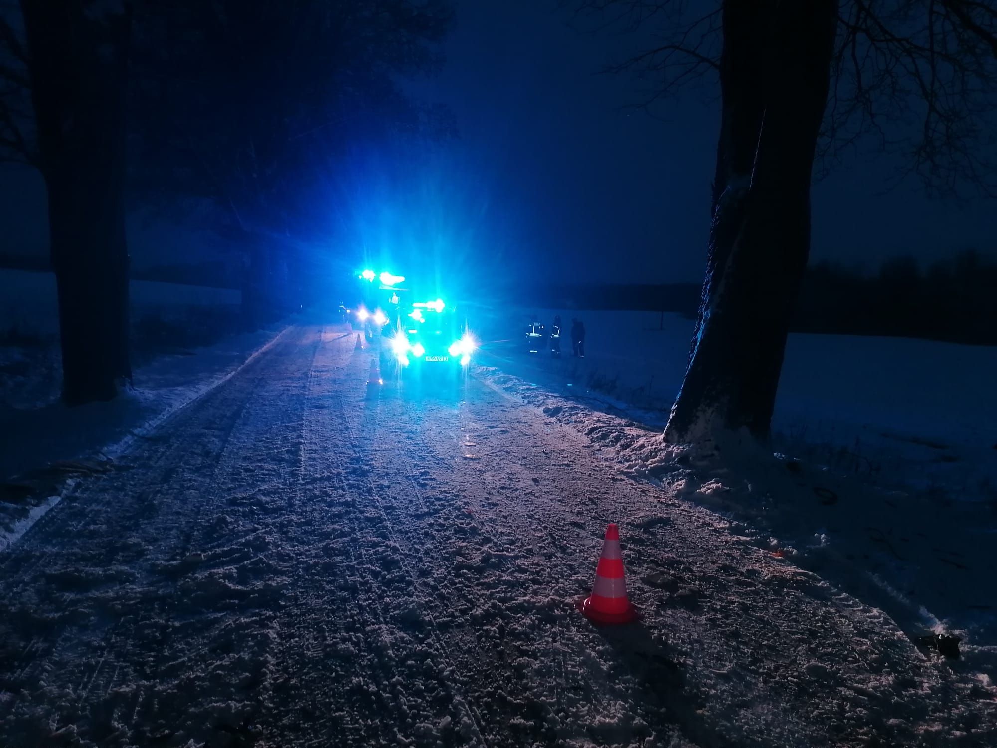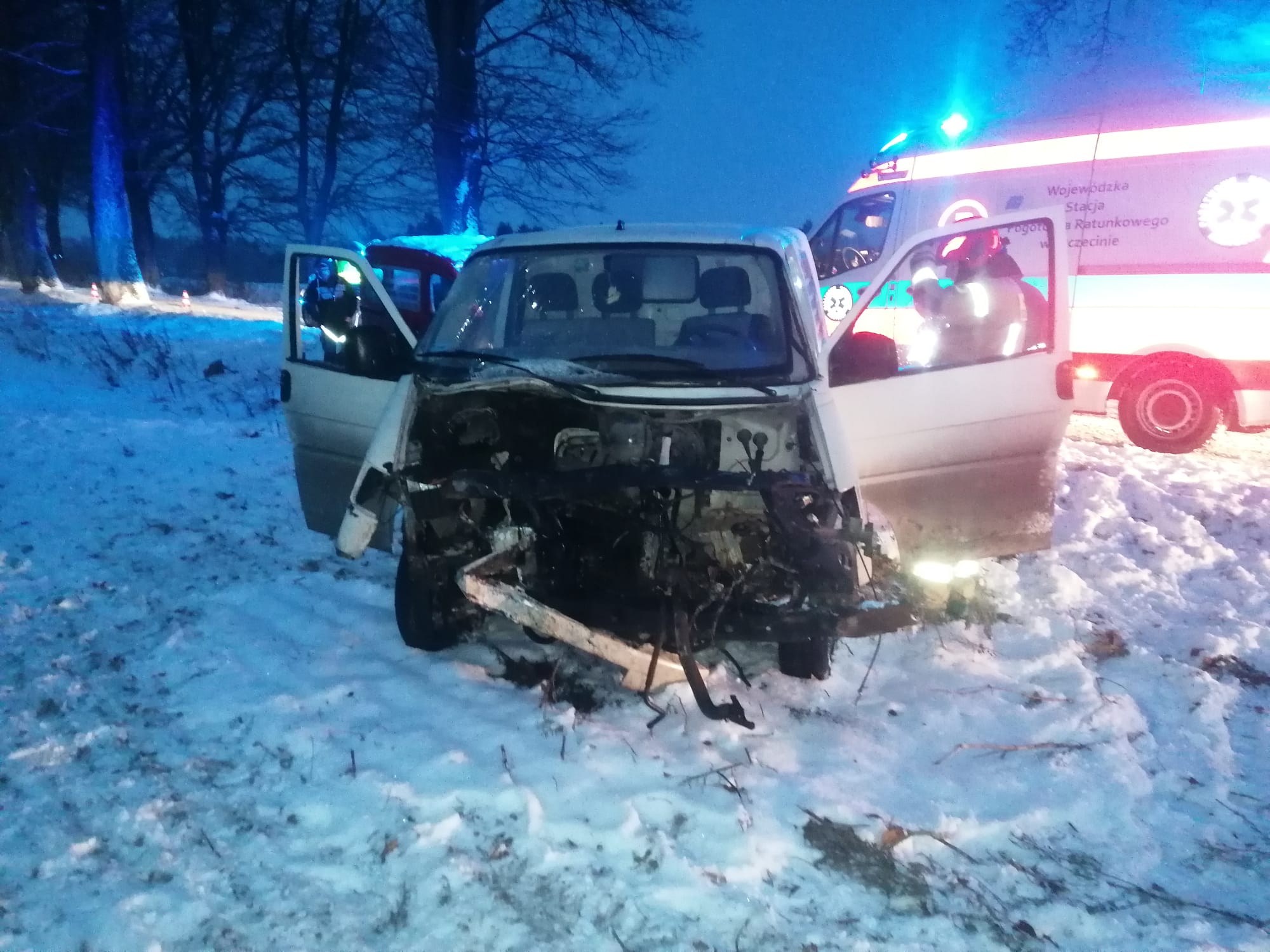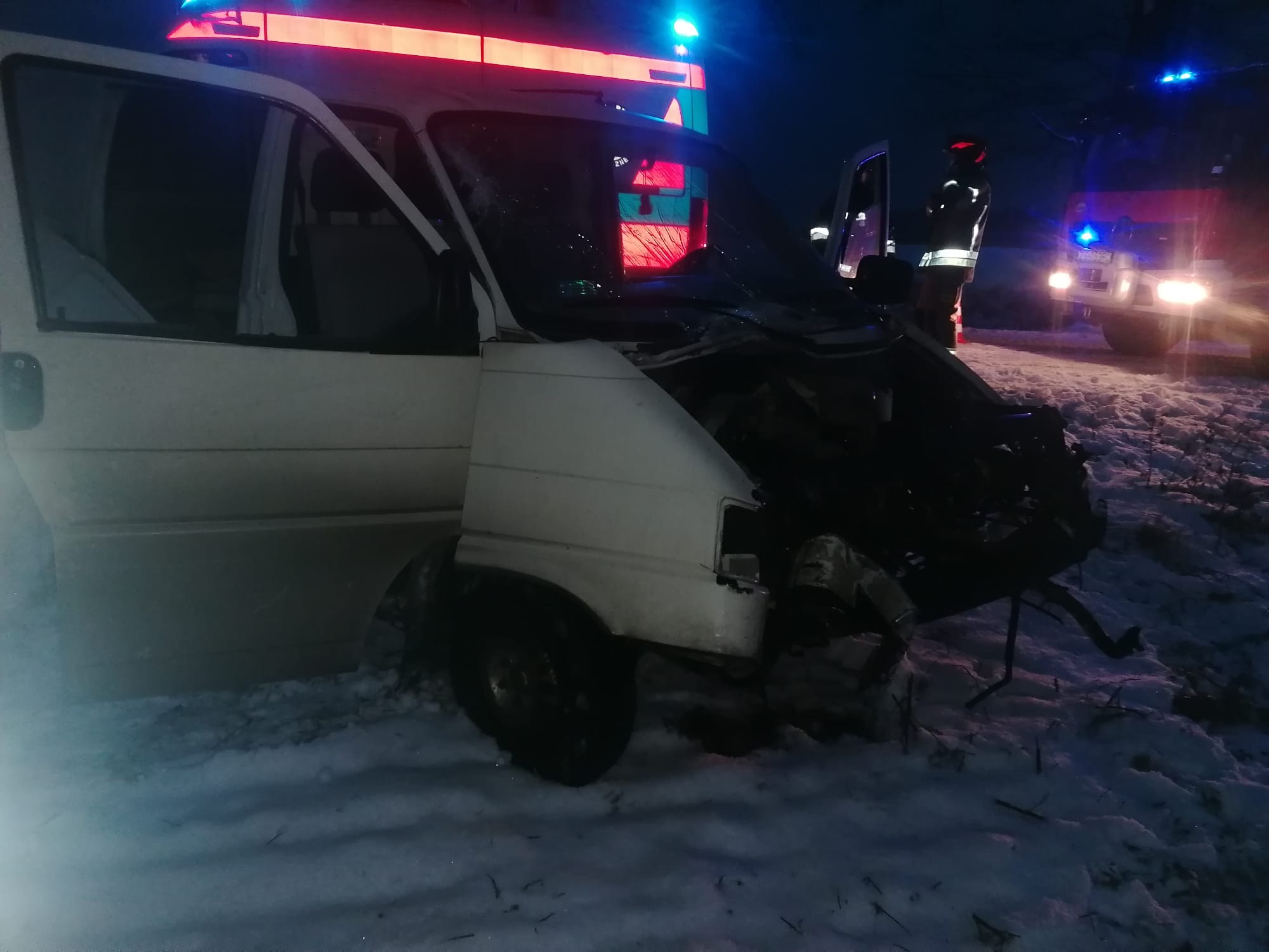 Po przyjeździe na miejsce zdarzenia pierwszych zastępów straży pożarnej okazało się, że samochód dostawczy uderzył w drzewo. Pojazdem podróżowały dwie osoby, które znajdowały się pod opieką ratowników medycznych z Zespołu Ratownictwa Medycznego.