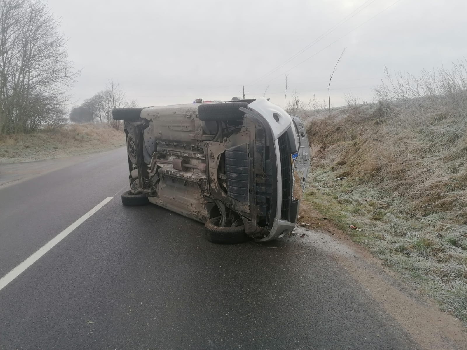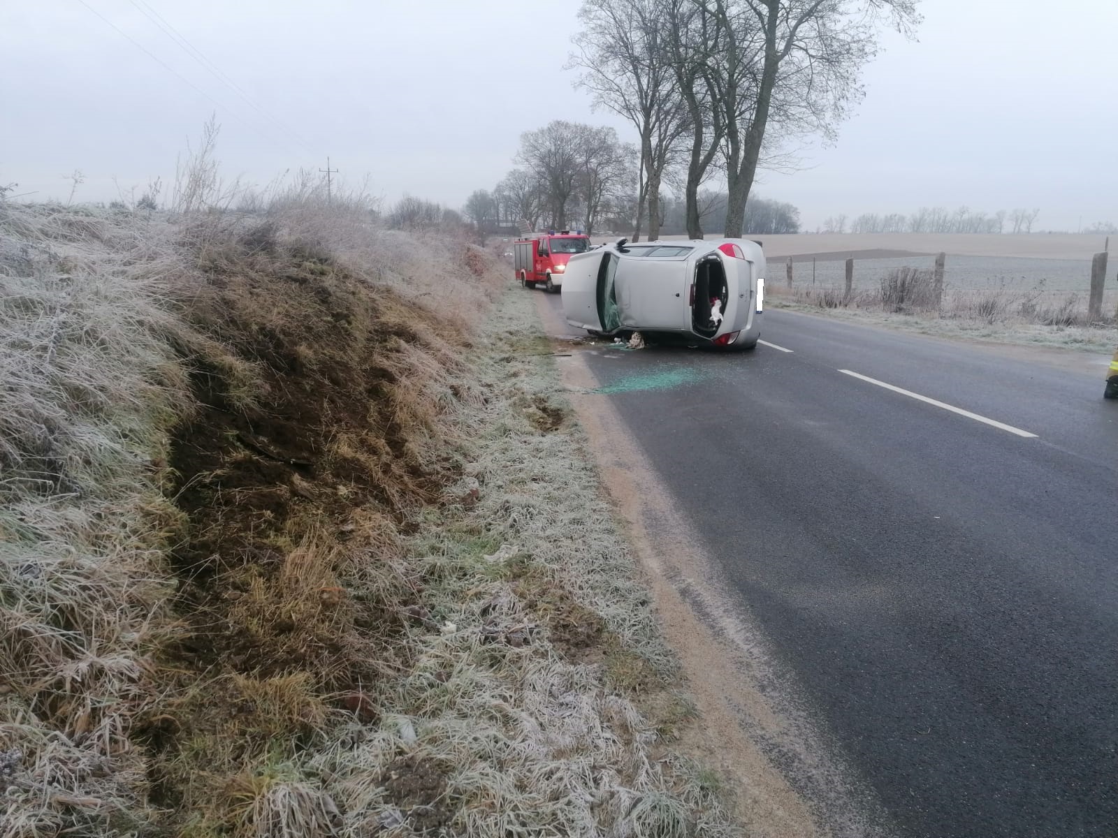 Po przyjeździe na miejsce zdarzenia straży pożarnej zastano samochód osobowy leżący na łuku drogi na boku. Kierujący pojazdem znajdował się po za pojazdem bez obrażeń.