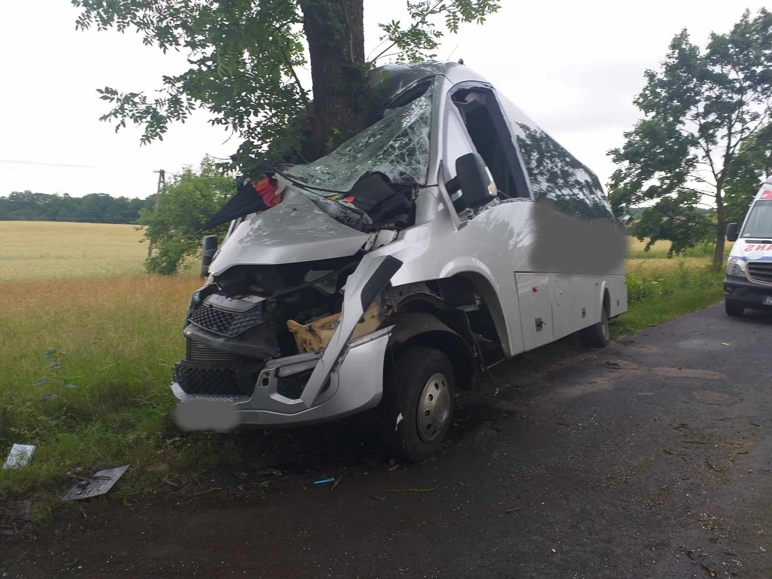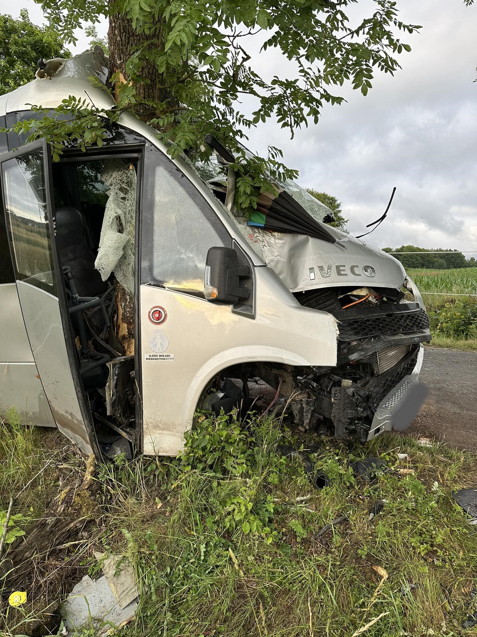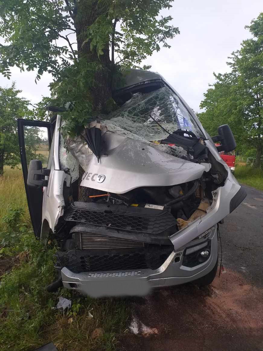 Po przyjeździe na miejsce zdarzenia straży pożarnej zastano samochód osobowy do przewozu osób, który uderzył w drzewo, a ranny kierowca znajdował się w samochodzie.