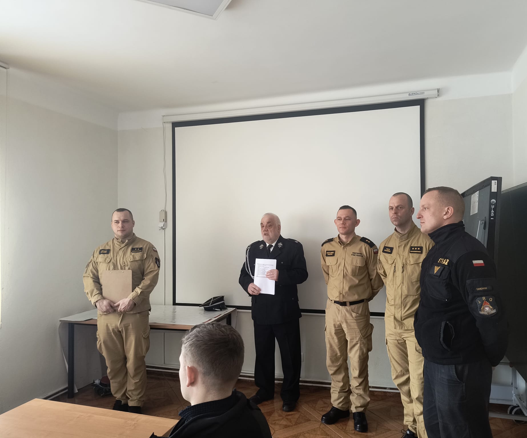 Świadectwa wręczył Zastępca Komendanta Powiatowego Państwowej Straży Pożarnej w Świdwinie mł. kpt. Bartłomiej Kozicki w asyście dh Zdzisława Pawelca – Prezesa Powiatowego ZOSP RP, starszego specjalisty ds. operacyjno-szkoleniowych mł. kpt. Damiana Mosiądza – kierownika szkolenia oraz kpt. Piotra Krasińskiego – dowódca zmiany III.