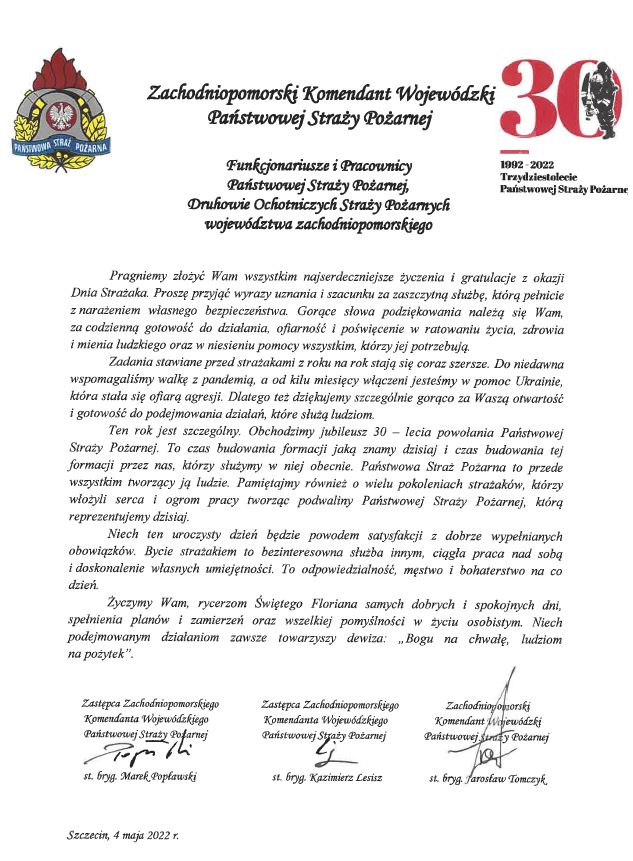 Życzenia z okazji Dnia Strażaka Zachodniopomorskiego Komendanta Wojewódzkiego Państwowej Straży PożarnejŻyczenia-Dzień-Strażaka-2022.pdf 0.09MB