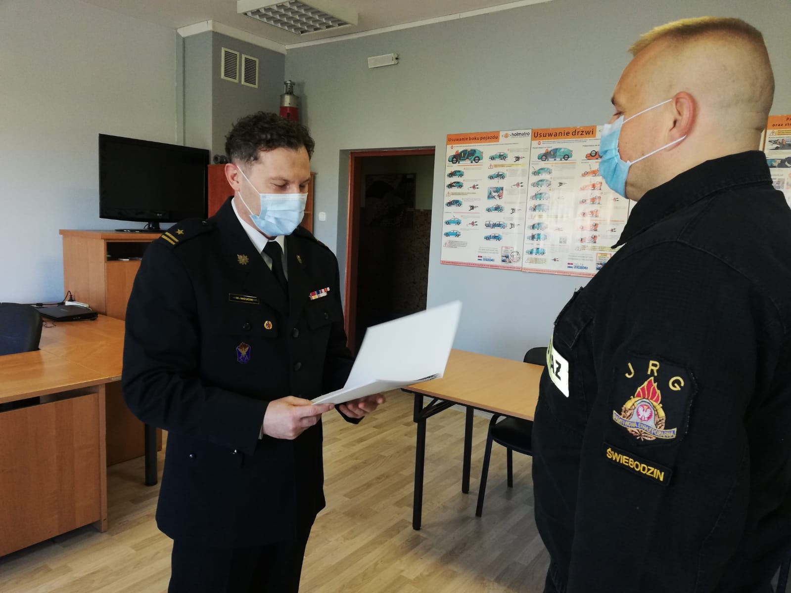 W dniu 27 kwietnia 2021 r. w Komendzie Powiatowej Państwowej Straży Pożarnej w Świebodzinie odbyła się uroczystość, podczas której Komendant Powiatowy Państwowej Straży Pożarnej w Świebodzinie mł. bryg. Mariusz Wójcik mianował mł. asp. Daniela Radziewicza na stanowisko dowódca sekcji oraz pogratulował jubileuszu 20 lat pracy zawodowej.