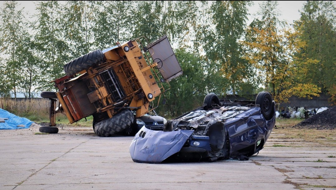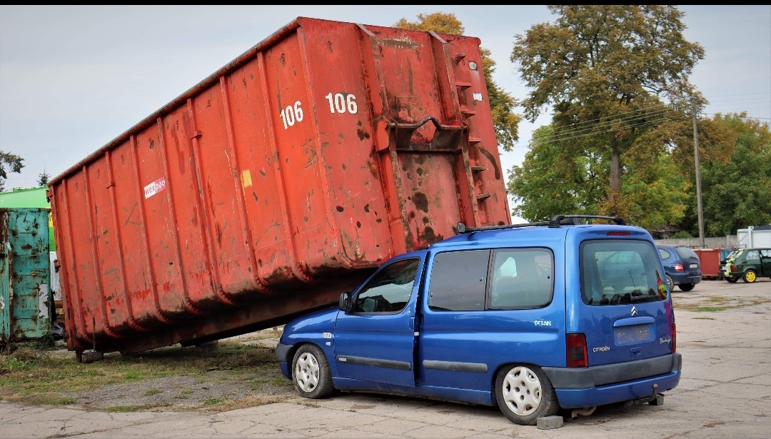 - epizod drugi - w wyniku nieprawidłowo zamocowanego metalowego kontenera na samochodzie ciężarowym oraz niezachowania odpowiedniej odległości pomiędzy pojazdami doszło przygniecenia samochodu osobowego.