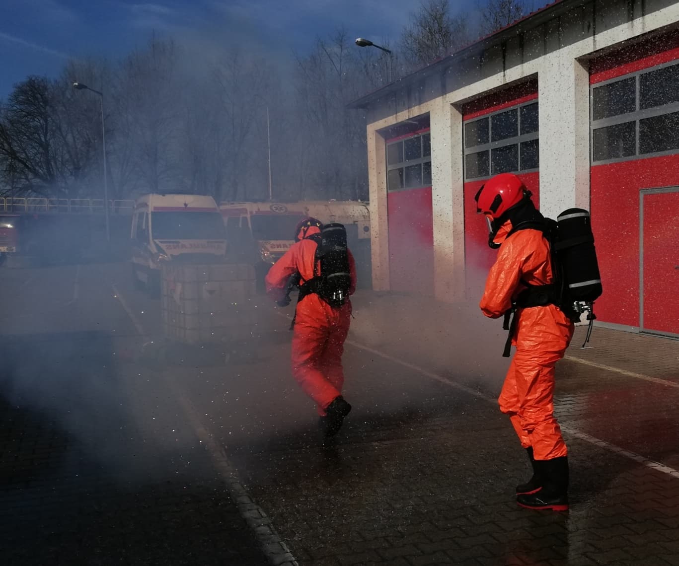 Ćwiczenia z taktyki działań ratowniczych w przypadku wycieku substancji niebezpiecznej na drodze.