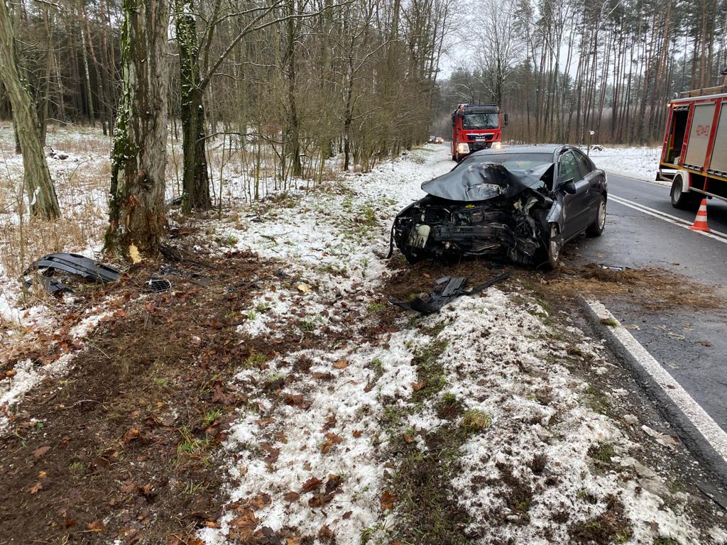 Po dojeździe zastępów na miejsce zdarzenia stwierdzono, że samochód osobowy jadący w kierunku Jezior uderzył czołowo w drzewo i znajdował się częściowo na jezdni. Samochodem podróżowała jedna osoba, która opuściła pojazd przed przybyciem służb.