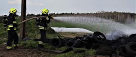 Po dojeździe zastępów na miejsce zdarzenia ustalono, że pożarem objęta jest hałda opon o wymiarach około 50 m2. Działania zastępów polegały na zabezpieczeniu miejsca zdarzenia oraz podaniu dwóch prądów gaśniczych wody w natarciu na palące się opony.