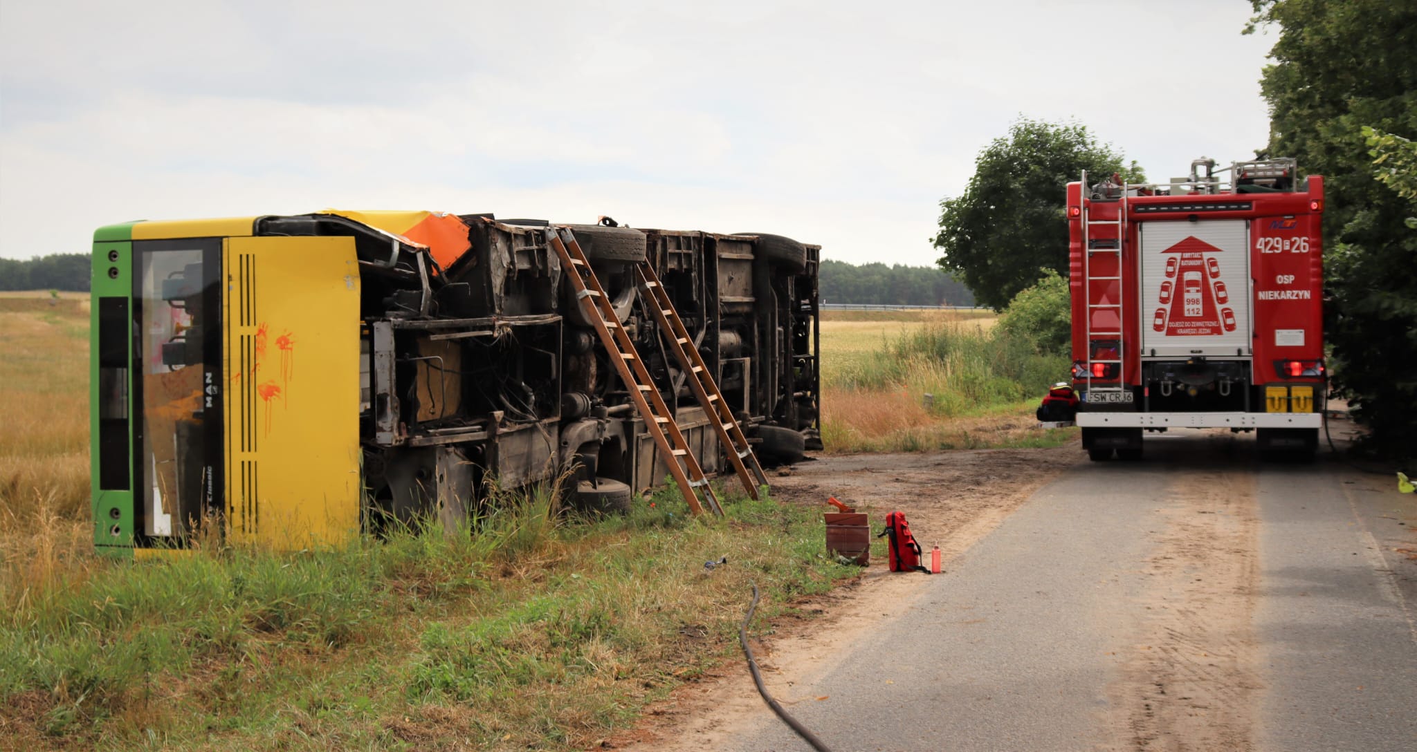 W dniu 1 lipca 2023 roku w wyniku złych warunków atmosferycznych (śliska nawierzchnia jezdni) oraz niedostosowania prędkości jazdy przez kierującego autobusem szkolnym dochodzi do przewrócenia pojazdu na prawy bok i uderzenia w przydrożne drzewo. Autobusem podróżowało 14 osób (2 dorosłe i 12 dzieci).