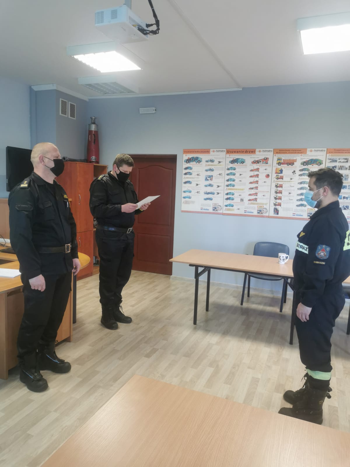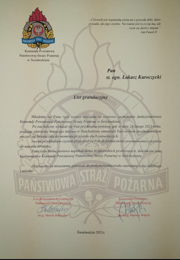 W dniu 3 marca 2021 r. za wzorową postawę poza czasem pełnienia służby, st. ogn. Łukasz Kuroczycki otrzymał pisemną pochwałę oraz list gratulacyjny od Komendanta Powiatowego PSP w Świebodzinie.