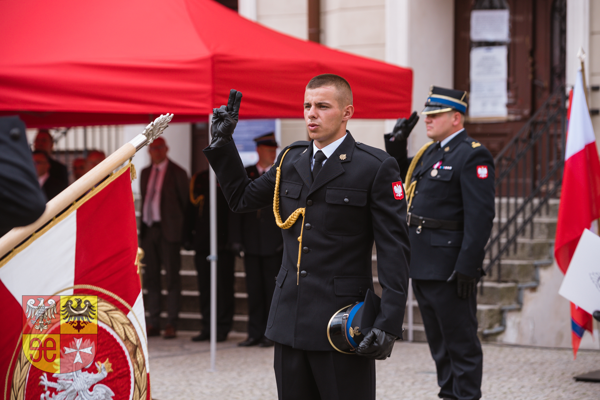 Następnym punktem uroczystości było złożenie ślubowania nowoprzyjętego funkcjonariusza do służby w Komendzie Powiatowej Państwowej Straży Pożarnej w Świebodzinie. str. Kamil Kowol złożył przed Panem bryg. Mariuszem Wójcikiem Komendantem Powiatowym PSP w Świebodzinie uroczyste ślubowanie.