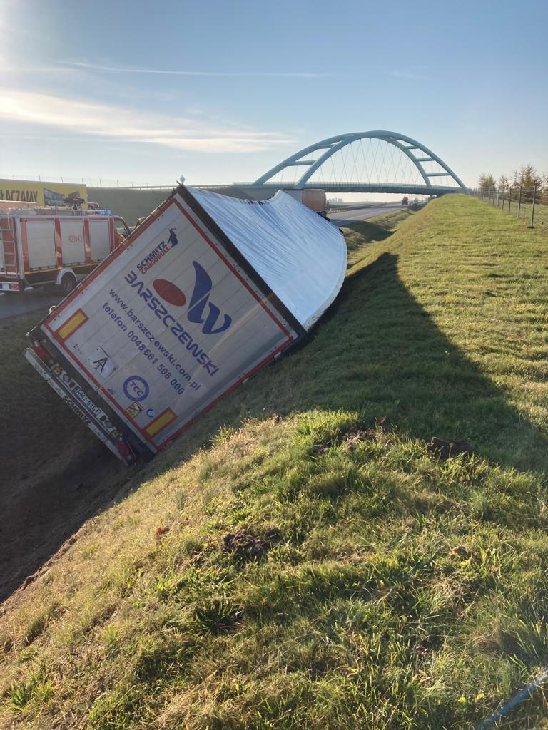 Do zdarzenia zadysponowano dwa zastępy z JRG Świebodzin i OSP Rzeczyca. Po dojeździe na miejsce zdarzenia stwierdzono, że samochód ciężarowy zjechał z drogi i oparł się prawym bokiem o nasyp pobocza. Auto znajdowało się w całości poza drogą i nie stwarzało zagrożenia dla innych użytkowników drogi. Kierujący pojazdem nie odniósł obrażeń i znajdował się poza pojazdem. Pojazd zabezpieczyły przybyłe na miejsce służby obsługi trasy S3.