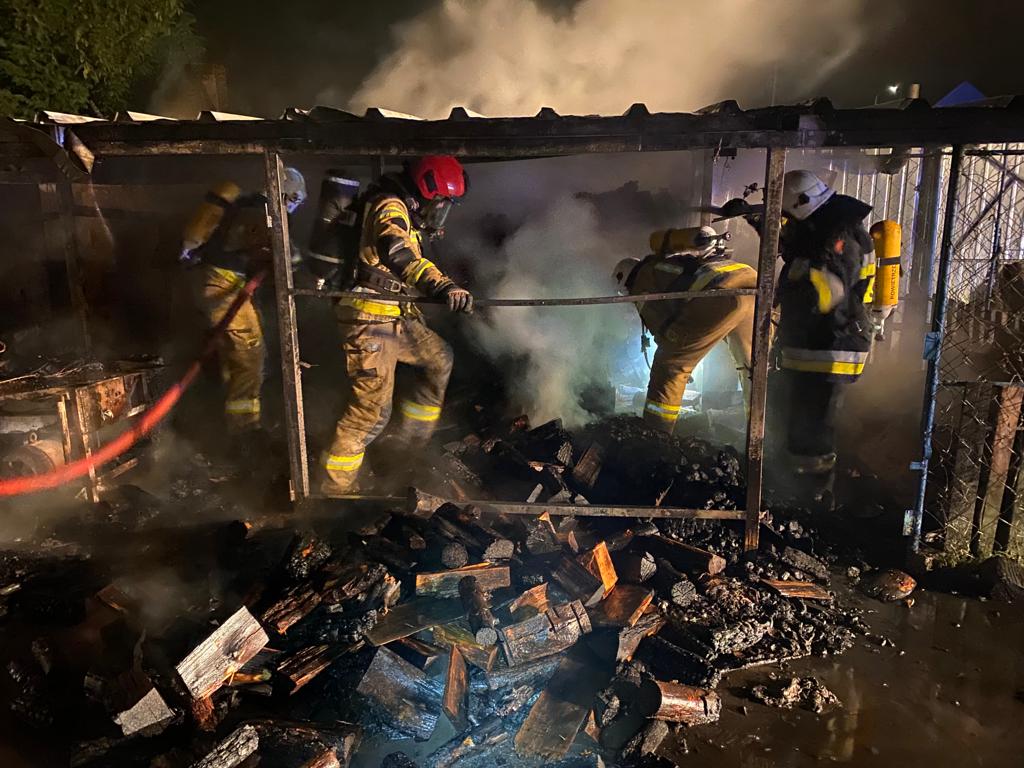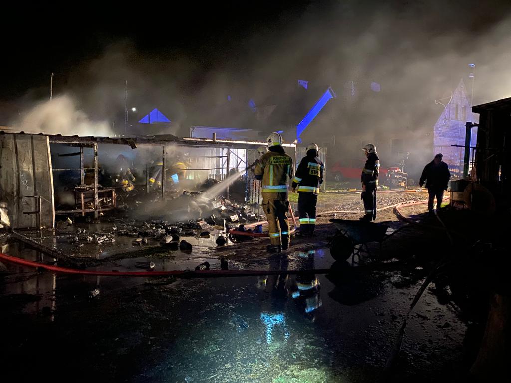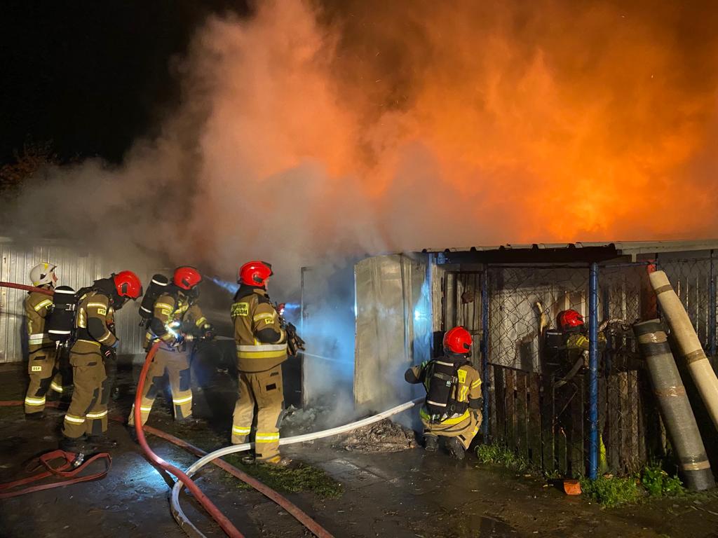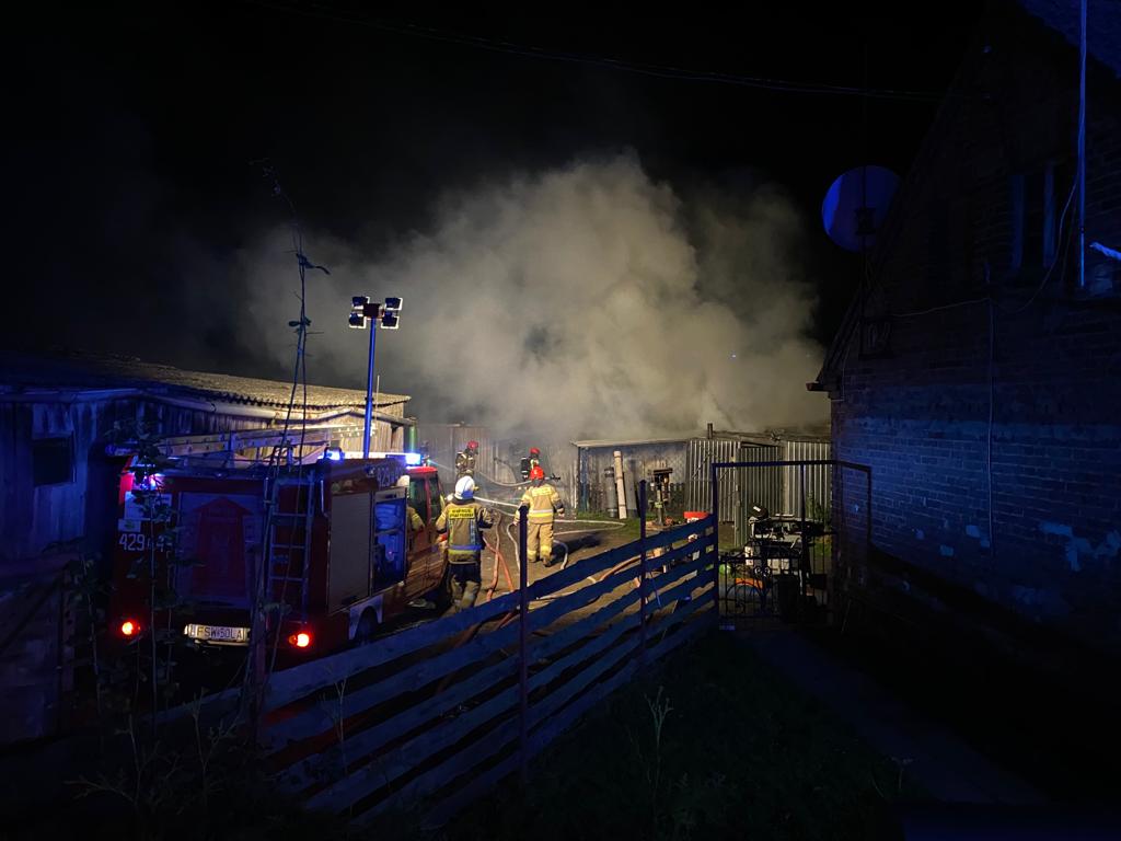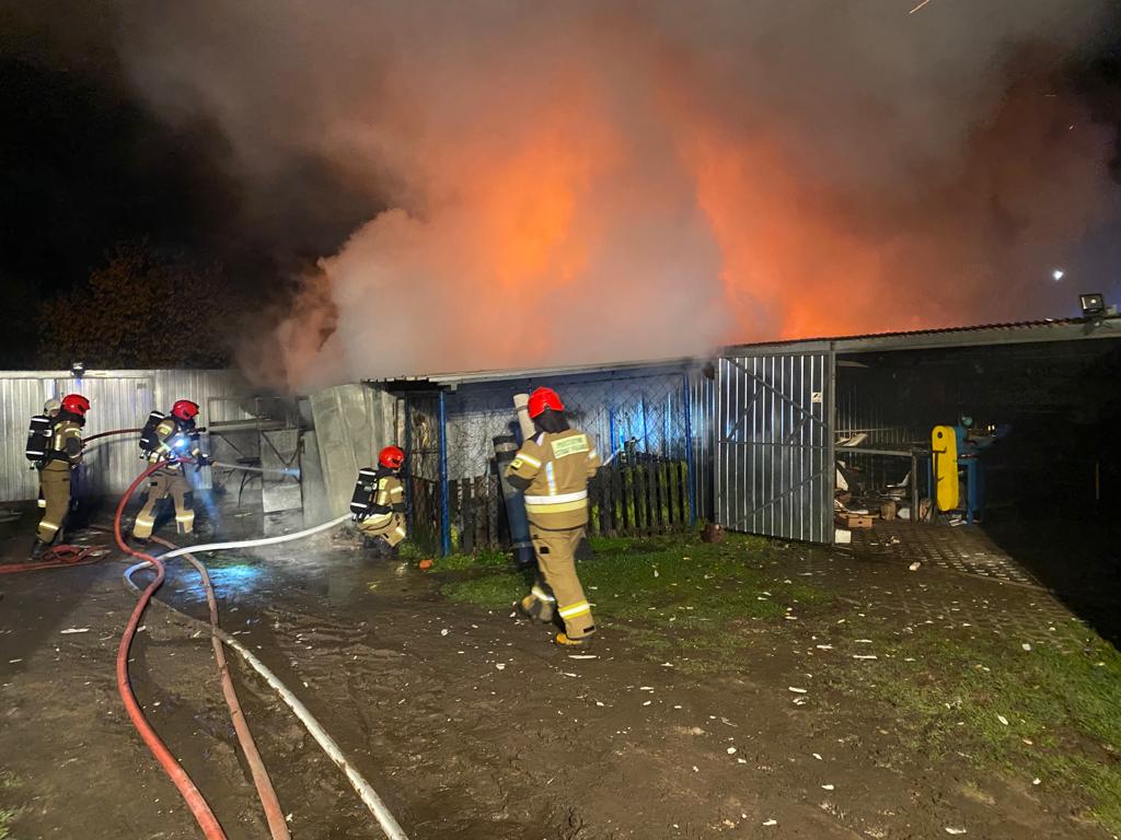 Po dojeździe na miejsce zdarzenia stwierdzono, że pożarem całkowicie objęty jest budynek gospodarczy, w którym znajdowały się opony, maszyny ślusarskie, motocykl oraz składowane było drewno opałowe. Dwa sąsiednie budynki magazynowe bezpośrednio zagrożone pożarem. Przed przyjazdem zastępów doszło do rozszczelnienia butli z gazem.