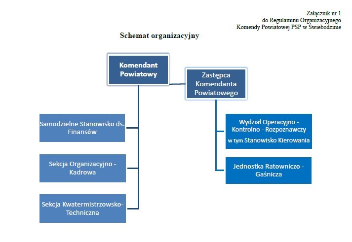 W skład komendy powiatowej wchodzą następujące komórki organizacyjne, które przy znakowaniu spraw i akt posługują się symbolami: