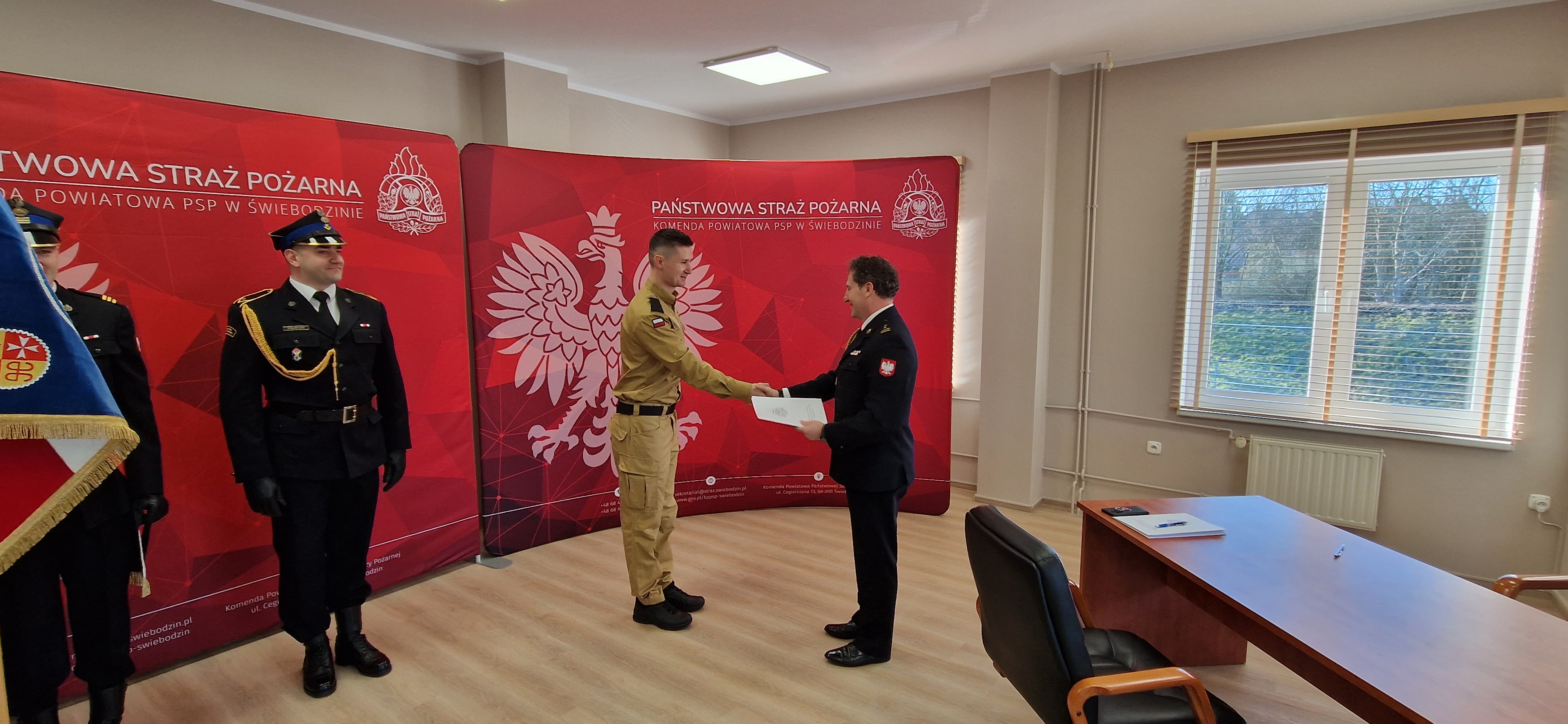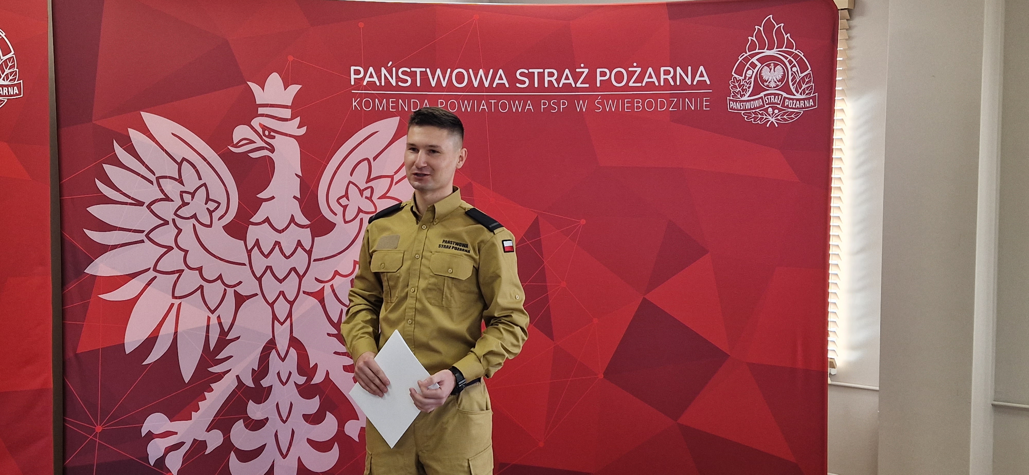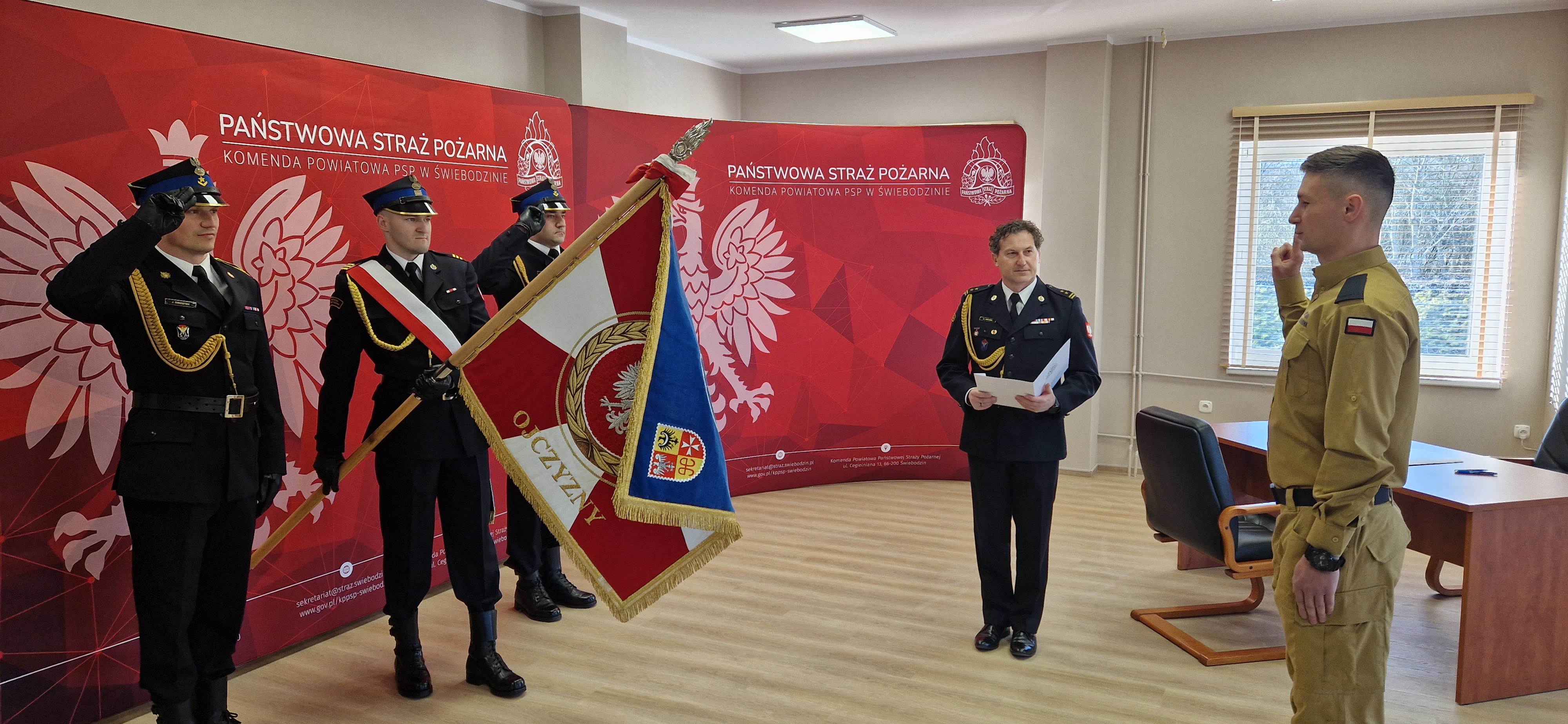 Tekst roty ślubowania strażaka Państwowej Straży Pożarnej w dniu 20 marca 2025 roku zabrzmiał w Komendzie Powiatowej PSP w Świebodzinie. Ślubowanie złożył nowoprzyjęty funkcjonariusz str. Adrian Budasz, w obecności kolegów i kadry kierowniczej, a odebrał Komendant Powiatowy bryg. Mariusz Wójcik, który przed ceremonią przytoczył słowa zasad etyki zawodowej: