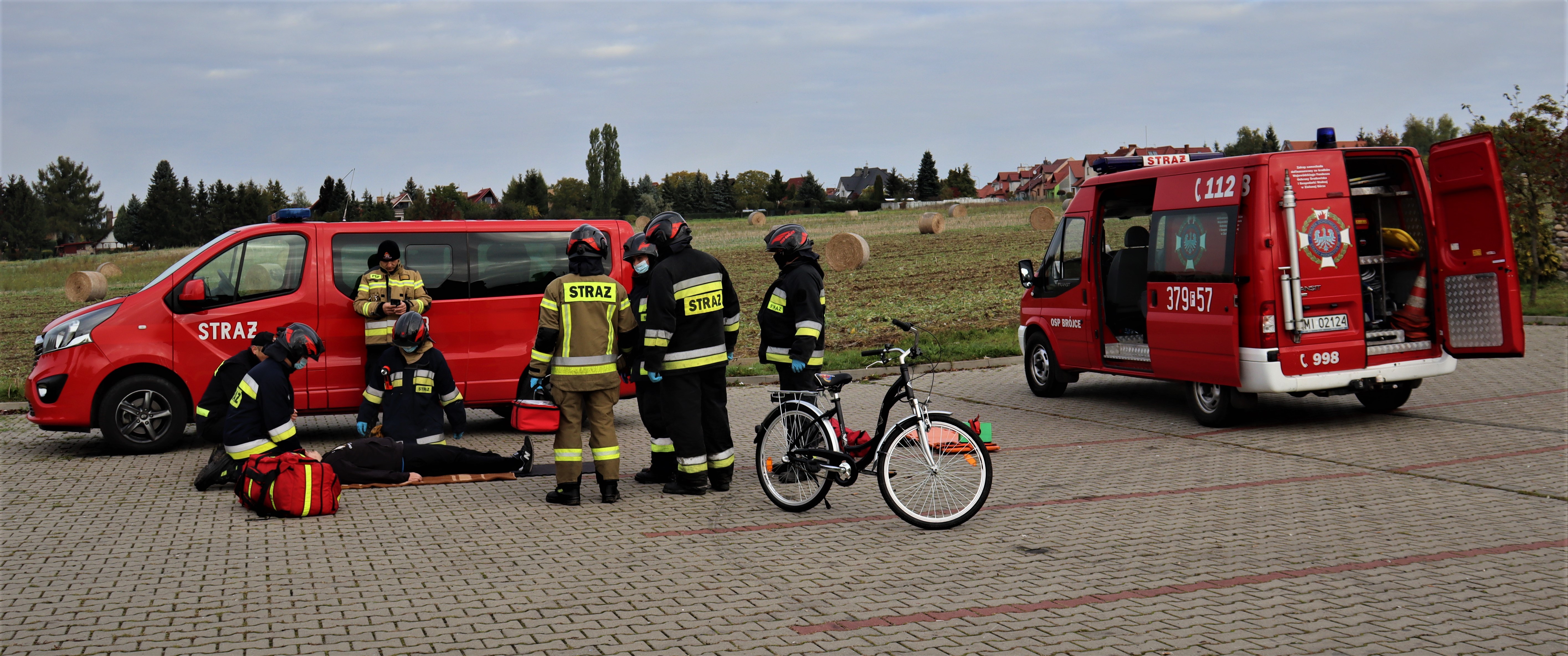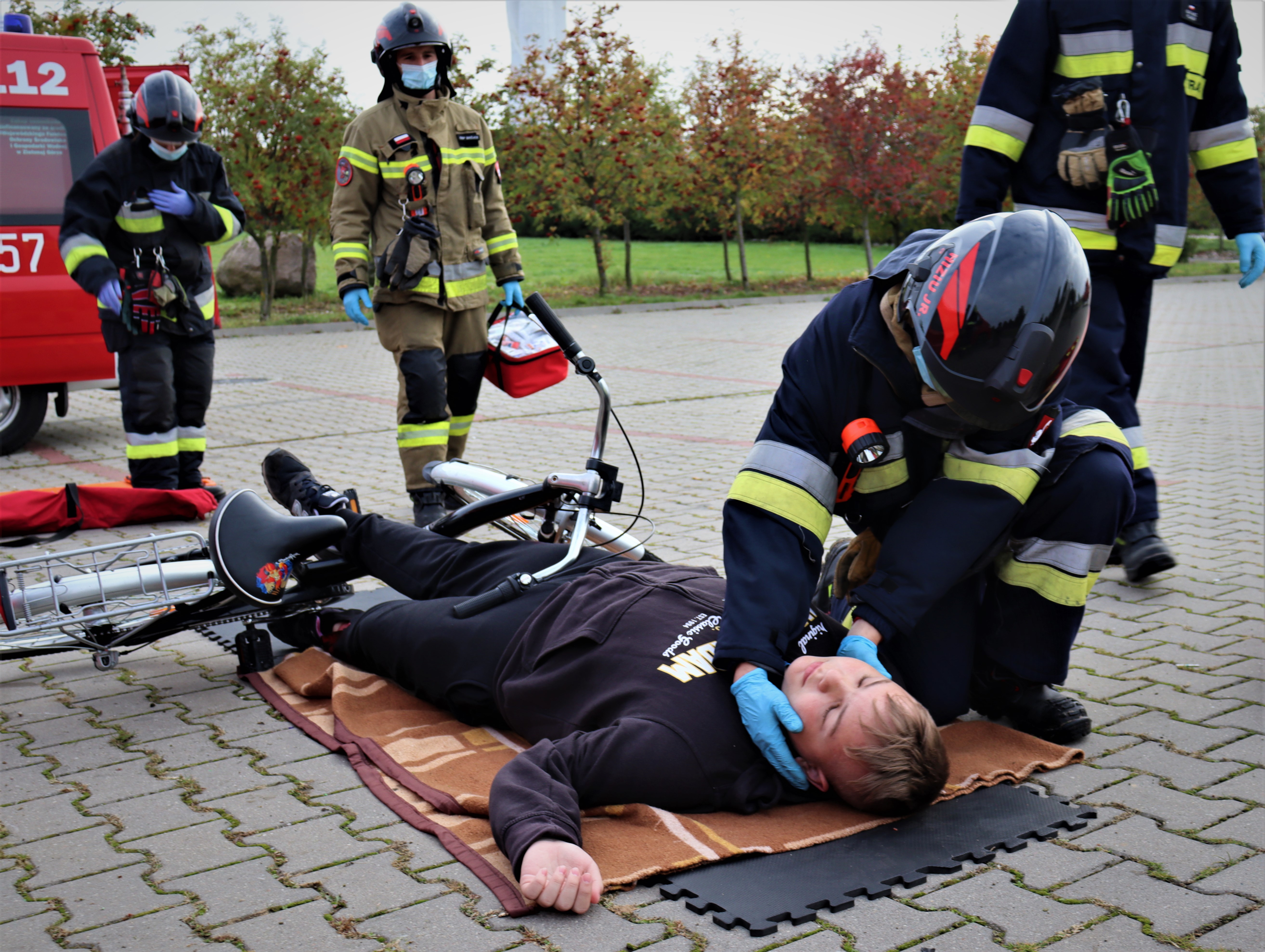 Z powodu braku karetki PRM została wezwana Straż Pożarna. Po dojeździe na miejsce zdarzenia ratownicy stwierdzają leżącego poszkodowanego obok roweru, który krzyczy że wywrócił się.
