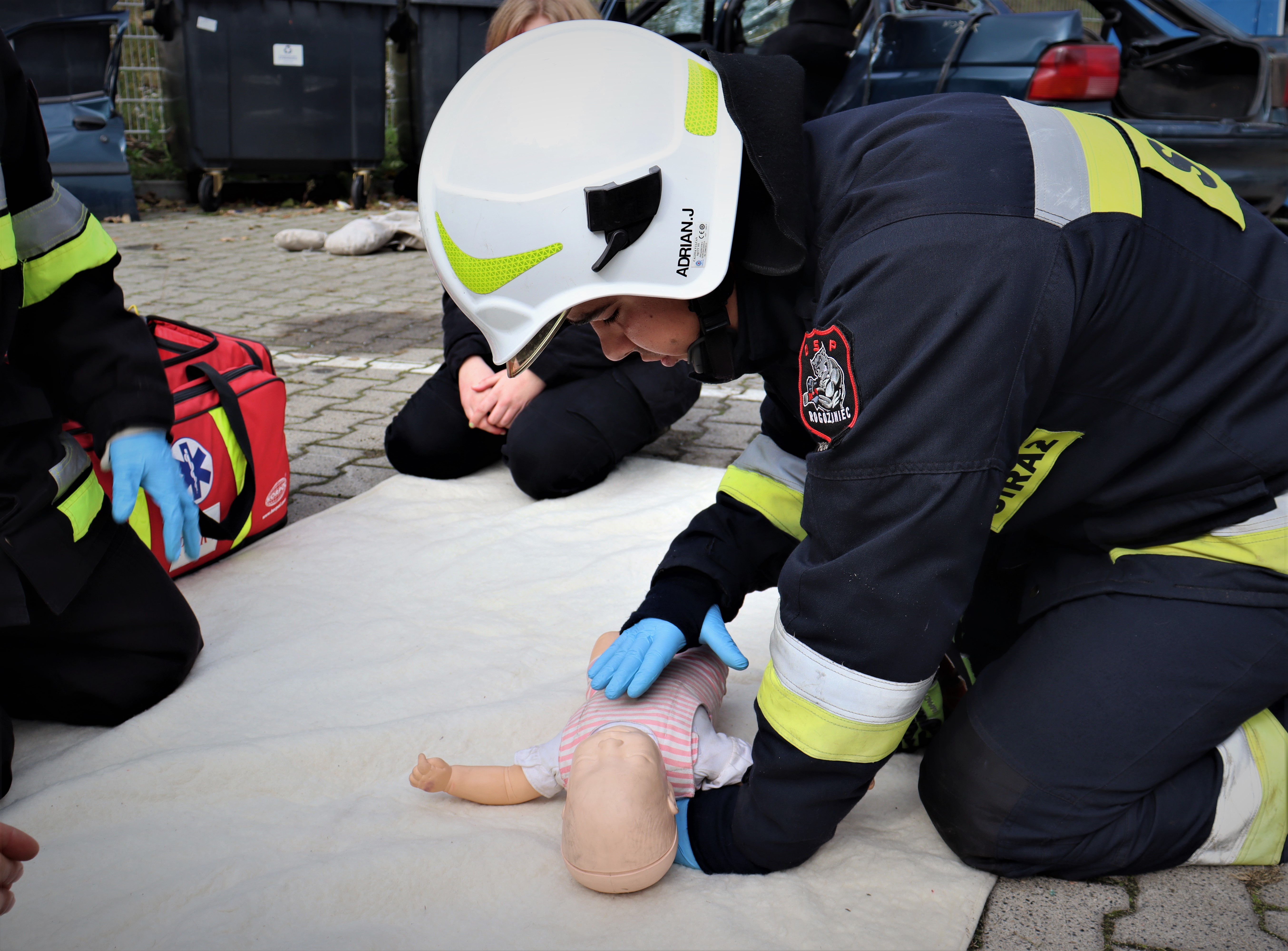 Kobieta prowadziła pojazd, w trakcie jazdy na drogę wybiegł pies kobieta zaczęła gwałtownie hamować, uderzyła w betonowy słup i wypadła z pojazdu. Auto przygniotło kobiecie udo, noga znajduje się pod kołem pojazdu. W aucie znajdowało się 8 miesięczne dziecko które pod wpływem zdarzenia zatrzymało się. Celem ratowników była stabilizacja pojazdu, podniesienie auta w celu uwolnienia kobiety i udzieleniu KPP oraz przywrócenie funkcji życiowych dziecku.