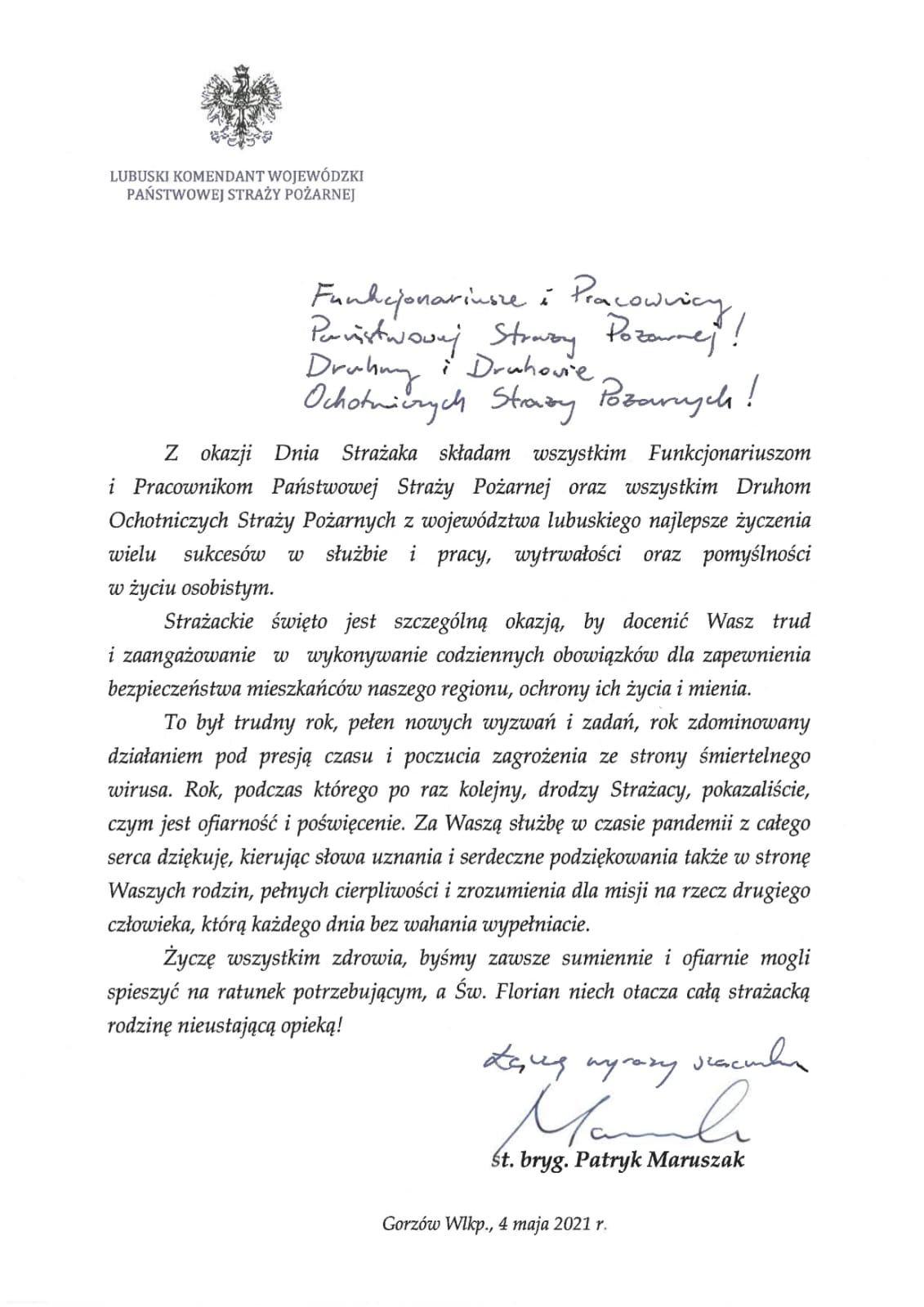 Z okazji Dnia Strażaka słowa uznania, gratulacje, podziękowania i życzenia przekazali dla funkcjonariuszy Państwowej Straży Pożarnej i pracowników cywilnych oraz druhów Ochotniczych Straży Pożarnych Marszałek Sejmu Rzeczypospolitej Polskiej Elżbieta Witek, Minister Spraw Wewnętrznych i Administracji Mariusz Kamiński, Komendant Główny Państwowej Straży Pożarnej nadbryg. Andrzej Bartkowiak wraz z Zastępcami oraz Lubuski Komendant Wojewódzki Państwowej Straży Pożarnej st. bryg. Patryk Maruszak.