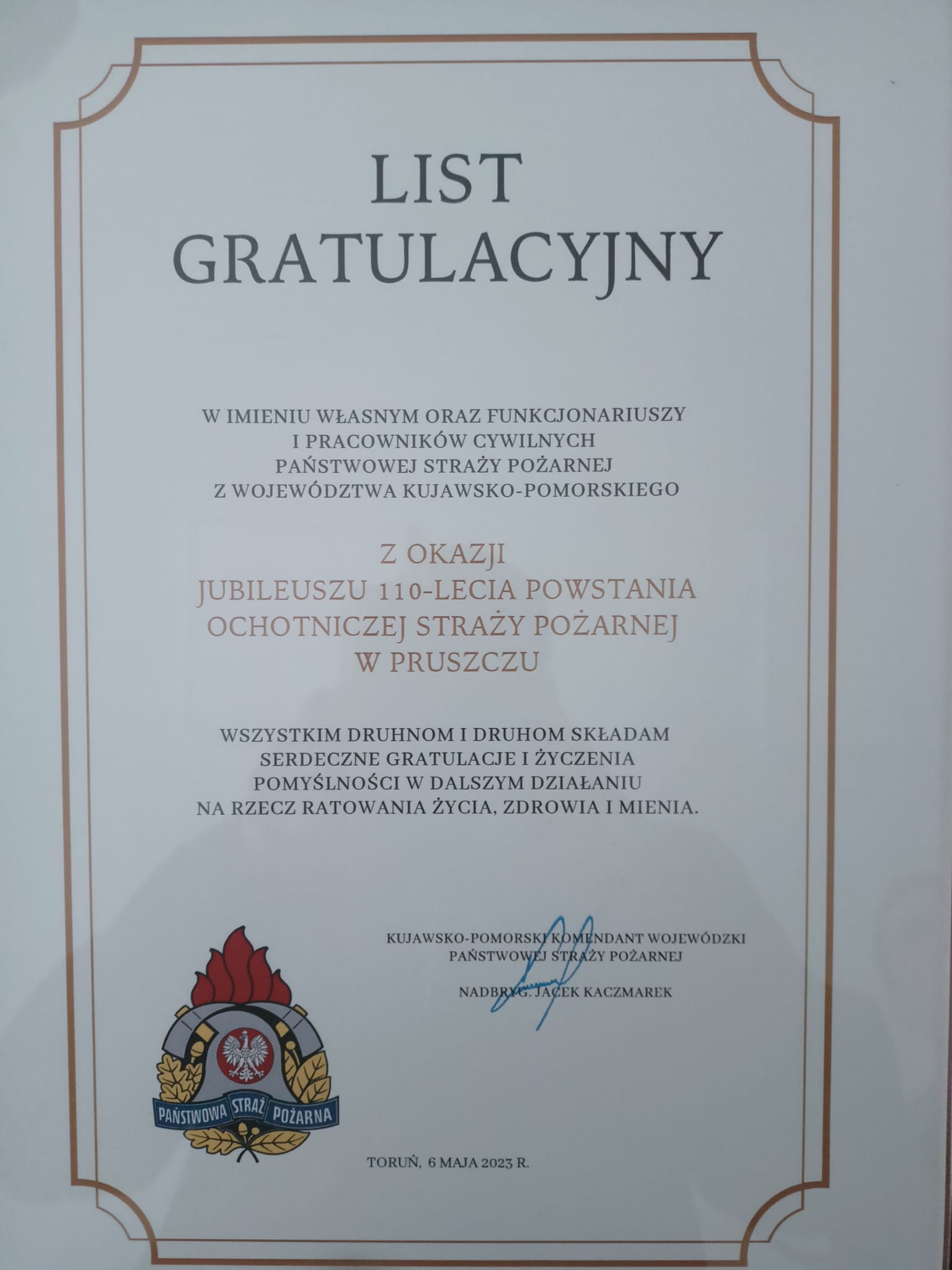 6 maja Z-ca Komendanta Powiatowego PSP w Świeciu st. bryg. Andrzej Rafalski uczestniczył w obchodach 110-lecia powstania Ochotniczej Straży Pożarnej w Pruszczu.
