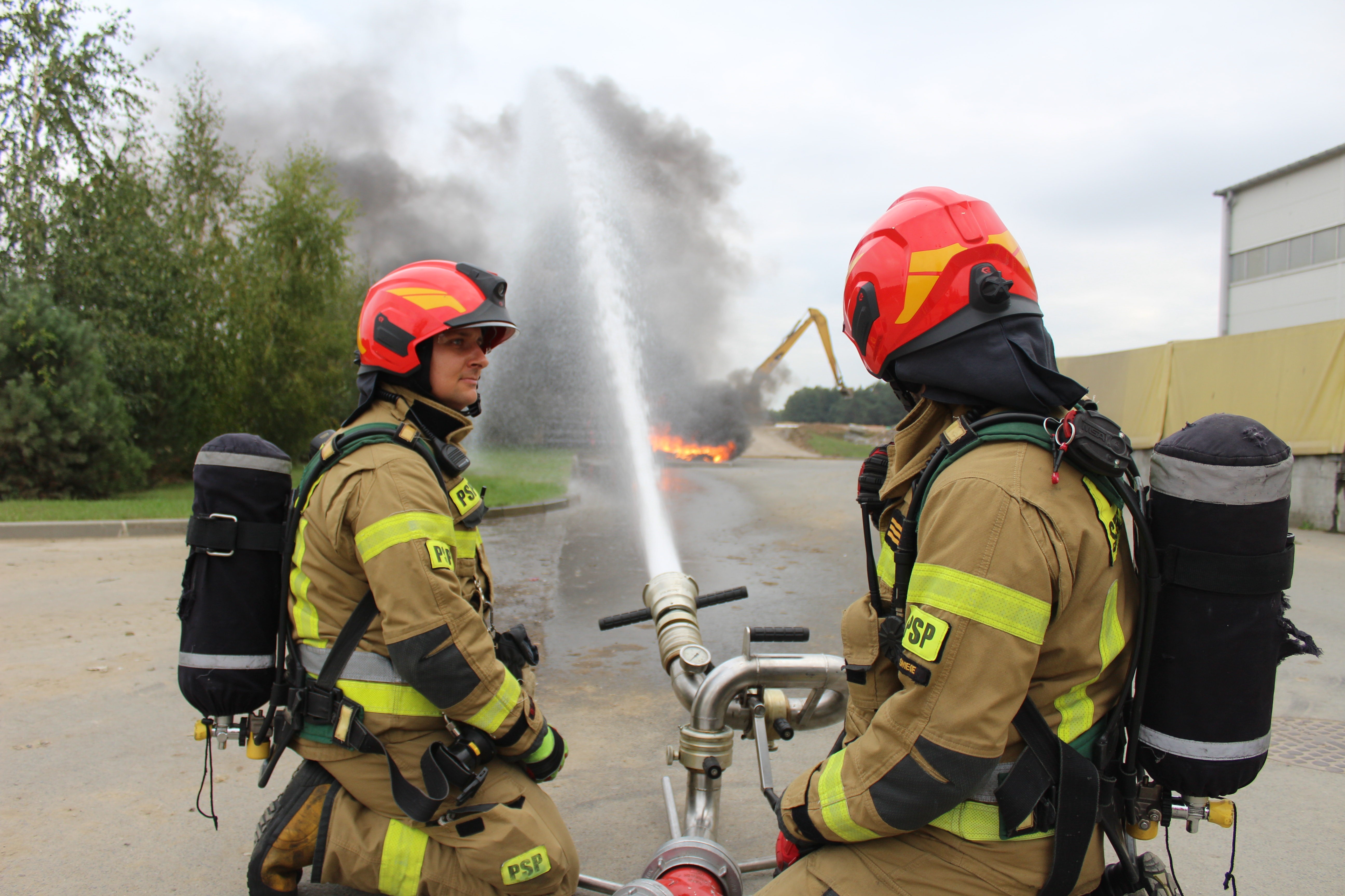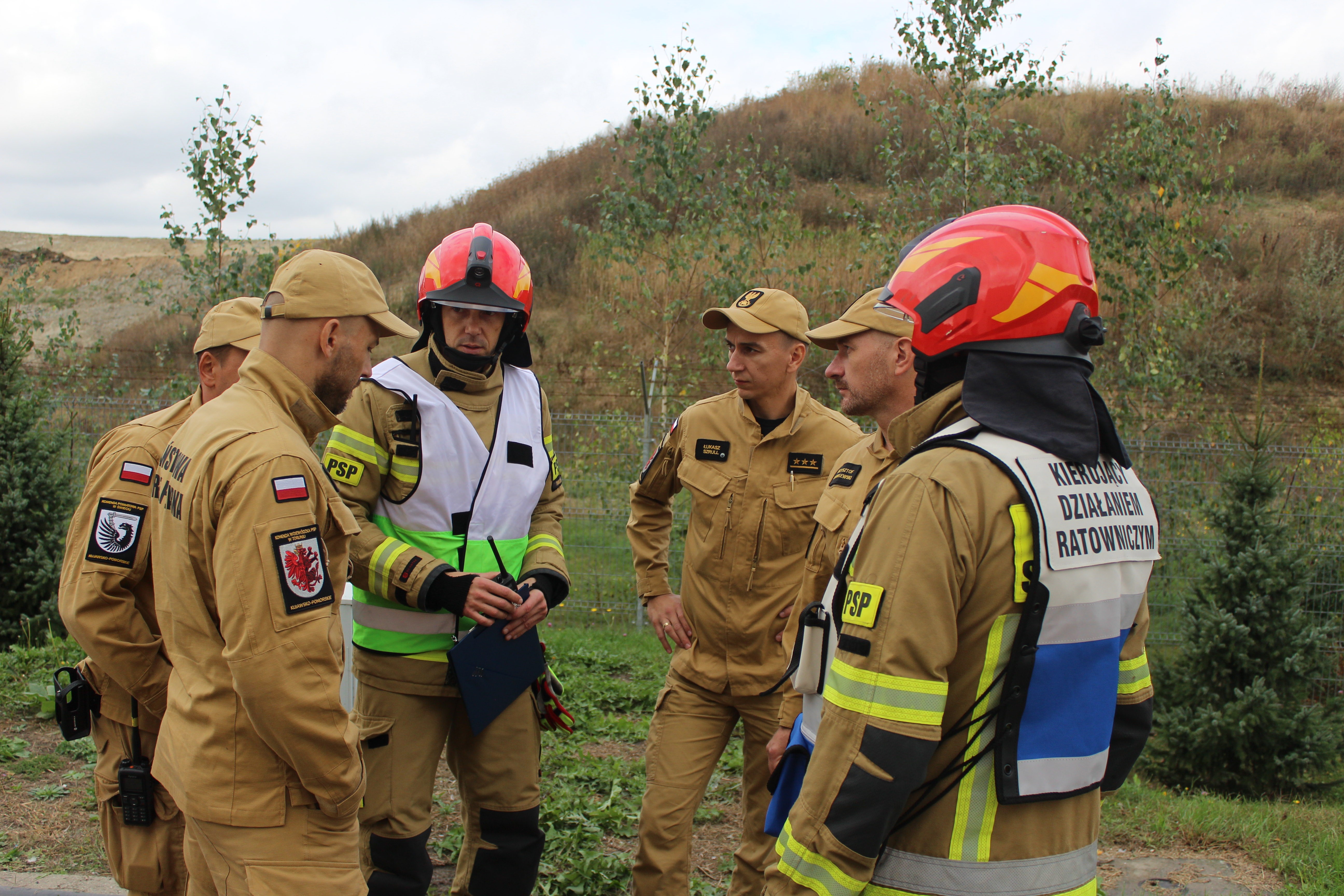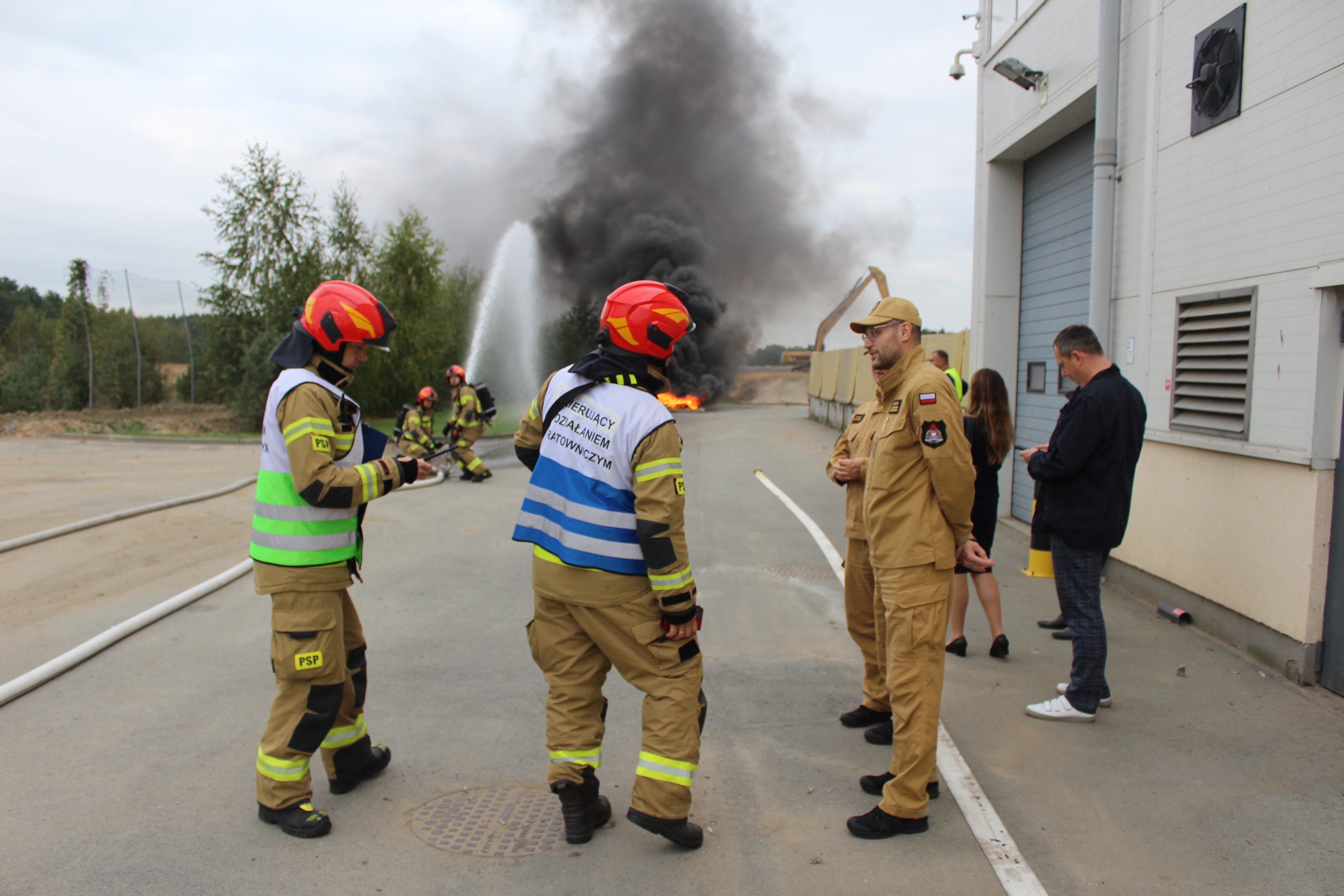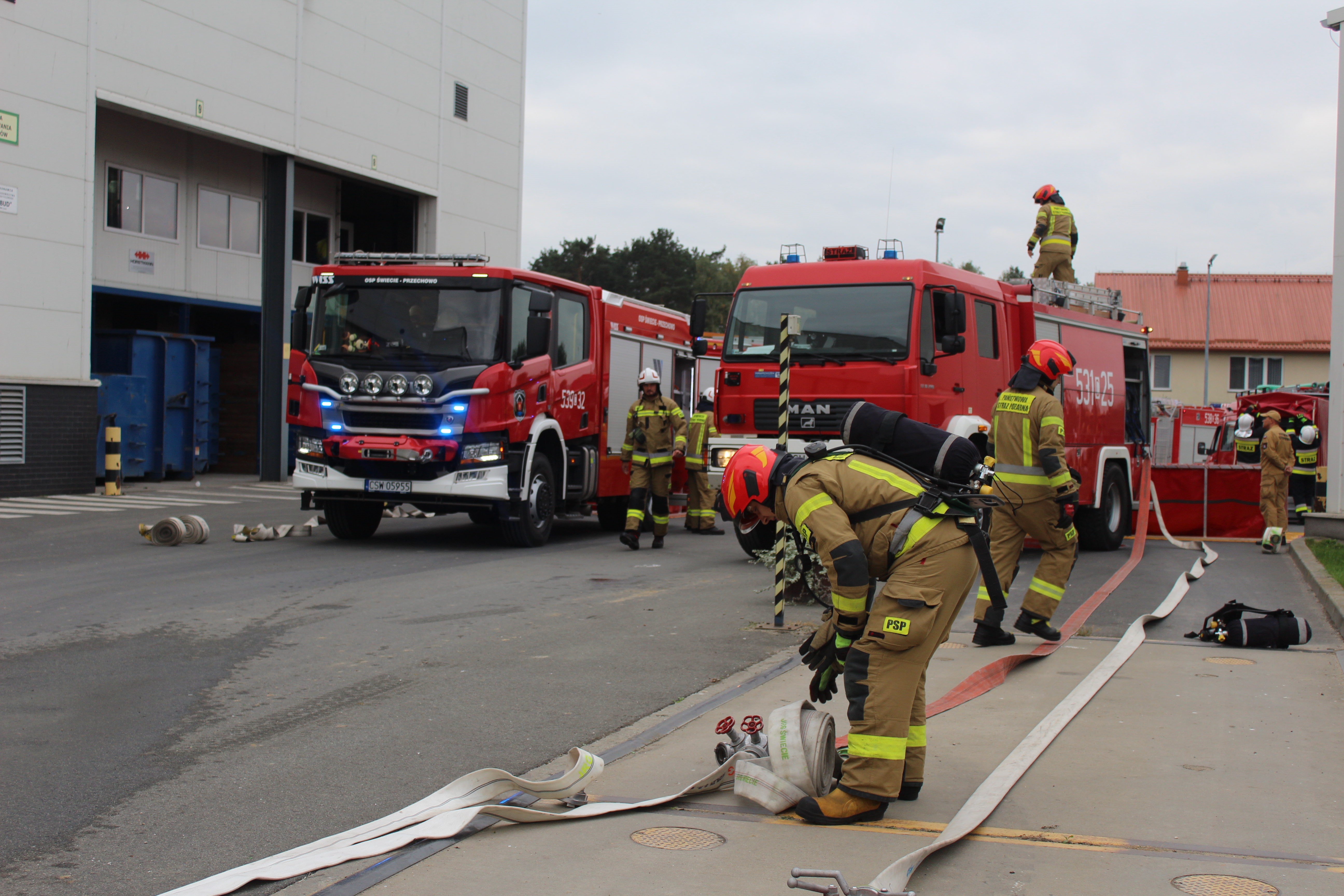 Ćwiczenia świeckich strażaków w zakładzie Eko-Wisła Sp. z o.o. - przedsiębiorstwo unieszkodliwiania odpadów.