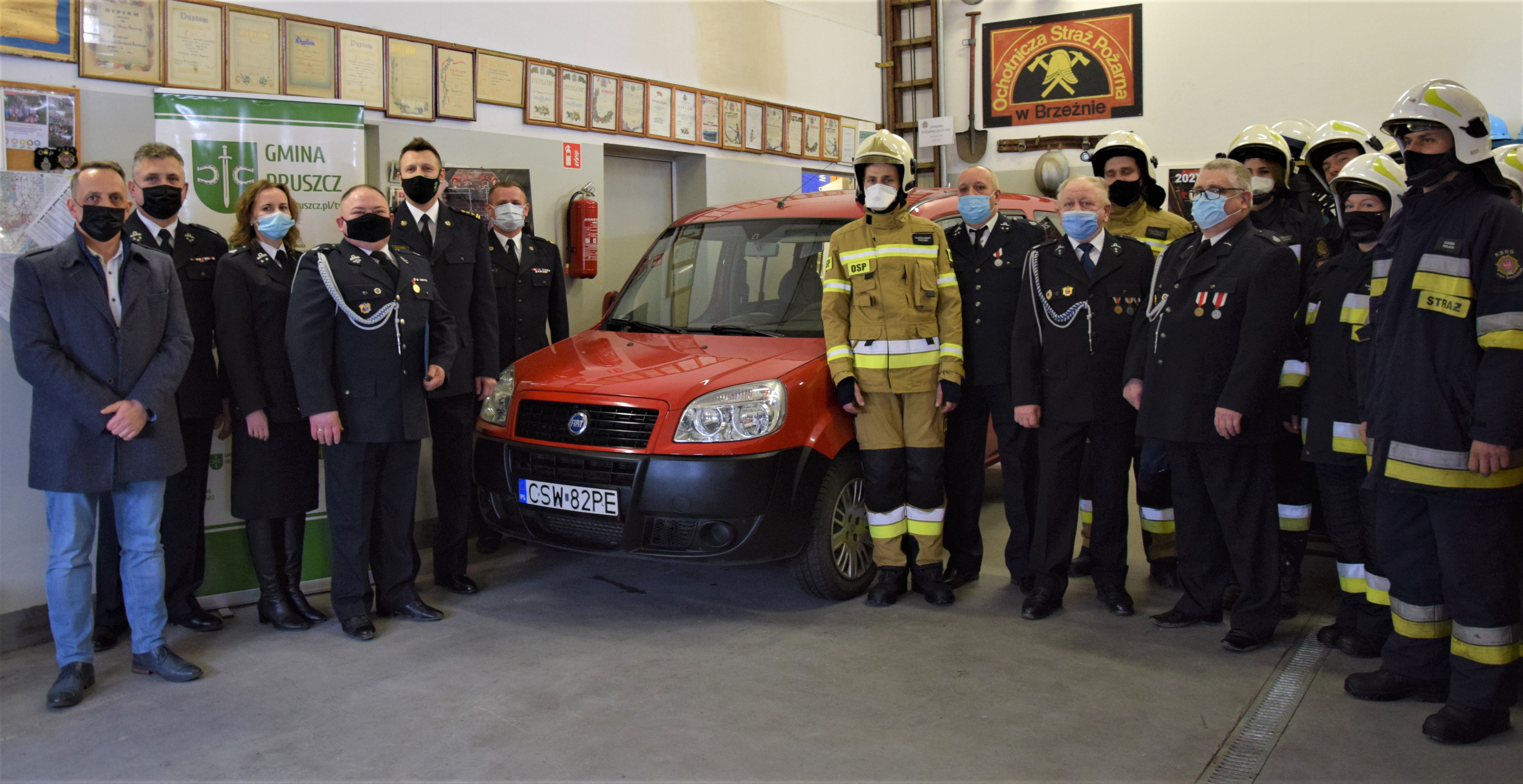 12 marca 2021 roku w siedzibie Ochotniczej Straży Pożarnej w Brzeźnie odbyło się przekazanie lekkiego samochodu kwatermistrzowskiego Fiat Doblo z Komendy Powiatowej PSP w Świeciu dla Ochotniczej Straży Pożarnej w Brzeźnie. Dzięki decyzji Kujawsko-Pomorskiego Komendanta Wojewódzkiego st. bryg. Jacka Kaczmarka, Komendant Powiatowy Państwowej Straży Pożarnej w Świeciu st. bryg. Piotr Tkaczyński przekazał na ręce Prezesa OSP Brzeźno dh Macieja Serafina akt przekazania pojazdu oraz kluczyki. W spotkaniu uczestniczyli Dowódca JRG Świecie mł. bryg. Paweł Puchowski, Wójt Gminy Pruszcz Pan Dariusz Wądołowski, Przewodniczący Rady Gminy Pan Piotr Radecki, Komendant Gminny OSP dh Grzegorz Pączek oraz druhny i druhowie OSP Brzeźno. Wójt Gminy Pruszcz podziękował za przekazany pojazd i podkreślił, iż z pewnością będzie przydatny i służył druhom oraz mieszkańcom gminy.