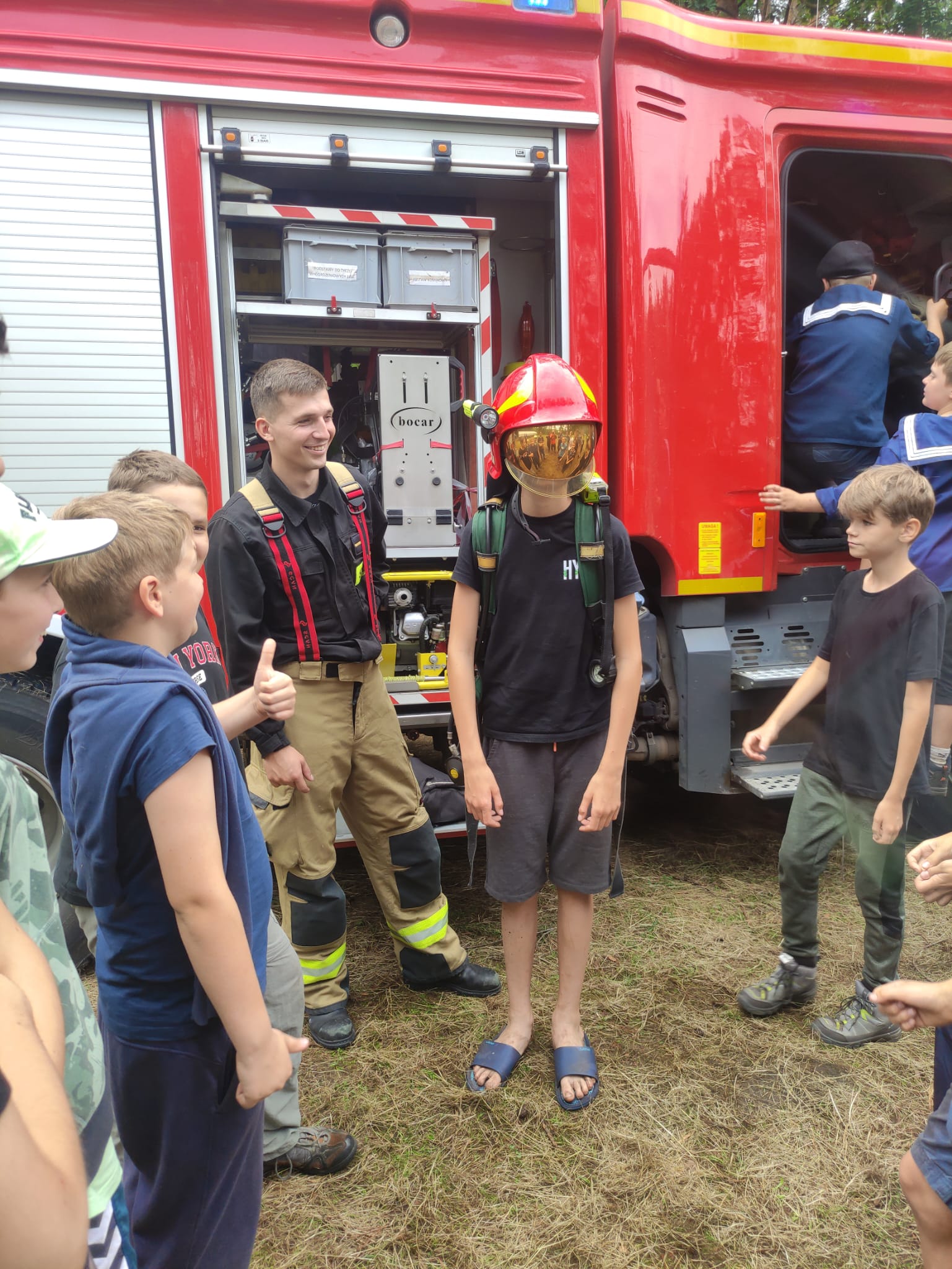 Funkcjonariusze omówili w jaki sposób należy zachować się w przypadku zagrożenia, zasady prawidłowego zachowania podczas ewakuacji oraz zdarzeń wywołanych siłami natury. W dalszej części spotkania poruszono tematy związane z zasadami udzielania pierwszej pomocy poszkodowanym. Dodatkowo został zaprezentowany i omówiony sprzęt pożarniczy będący na wyposażeniu samochodu z JRG Świecie oraz obozu.