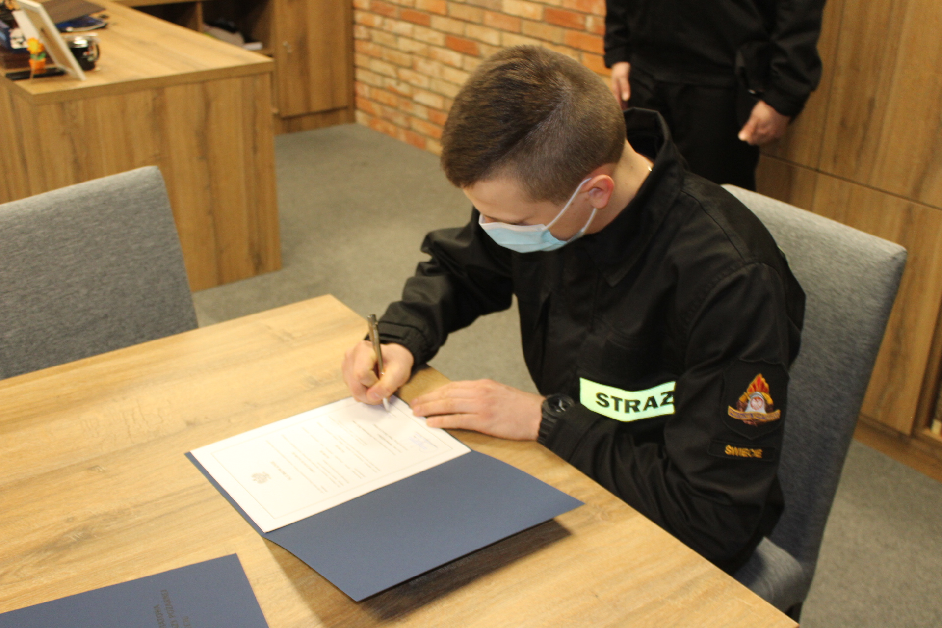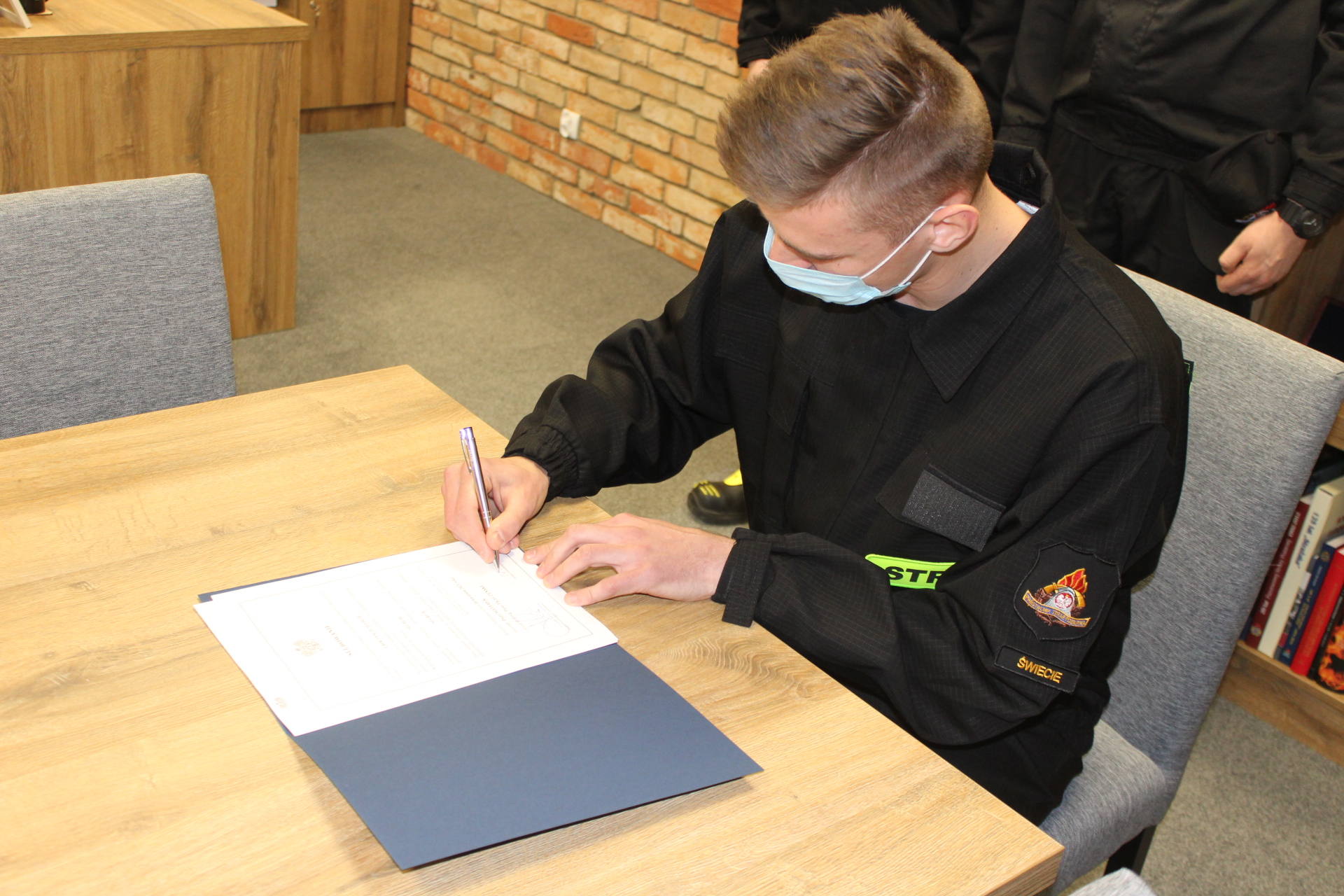 16 kwietnia 2021 roku w Komendzie Powiatowej Państwowej Straży Pożarnej w Świeciu odbyła się uroczystość ślubowania funkcjonariuszy: str. Mateusza Deręgowskiego, str. Michała Kęska i str. Piotra Materek. Ślubowanie przyjął Komendant Powiatowy PSP st. bryg. Piotr Tkaczyński. W uroczystości wziął udział również Dowódca Jednostki Ratowniczo – Gaśniczej mł. bryg. Paweł Puchowski